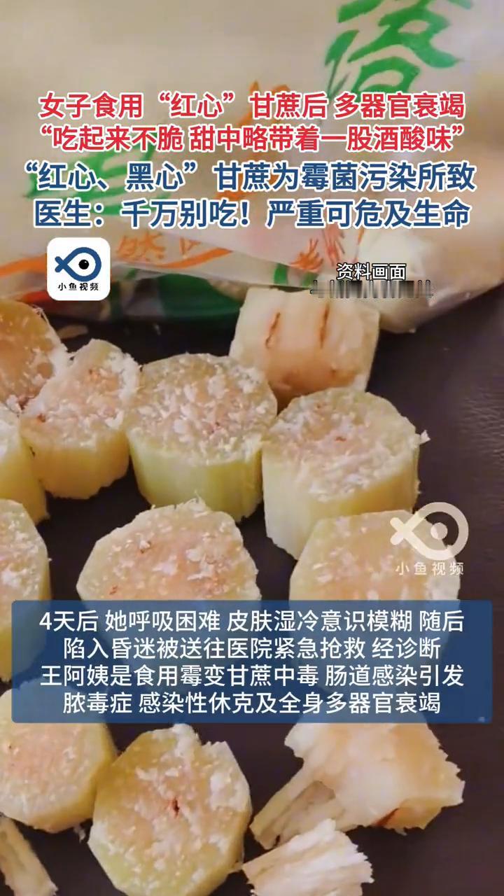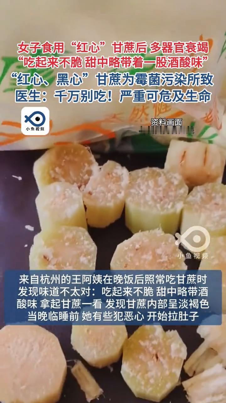 女子食用"红心"甘蔗后多器官衰竭,"吃起来不脆甜中略带着一股酒酸味"。"红心、黑心"甘蔗为霉菌污染所致。医生:千万别吃!严重可危及生命。 口感清甜的甘蔗是不少人的"心头好",但在品尝这份甘甜的同时大家也需要多加注意,一旦误食了变质的甘蔗可能导致中毒,严重或可致命。 来自杭州的王阿姨在晚饭后照常吃甘蔗时发现味道不太对,吃起来不脆甜中略带酒酸味,拿起甘蔗一看发现甘蔗内部呈淡褐色。当晚临睡前她有些犯恶心开始拉肚子,4天后她呼吸困难皮肤湿冷意识模糊,随后陷入昏迷被送往医院紧急抢救。 经诊断,王阿姨是食用霉变甘蔗中毒肠道感染引发脓毒症感染性休克及全身多器官衰竭。医生提醒买来的甘蔗建议当天吃完,不要放到次日或第三天再吃,出现"红芯"千万别吃赶紧扔掉。甘蔗中毒 甘蔗霉变 甘蔗事故