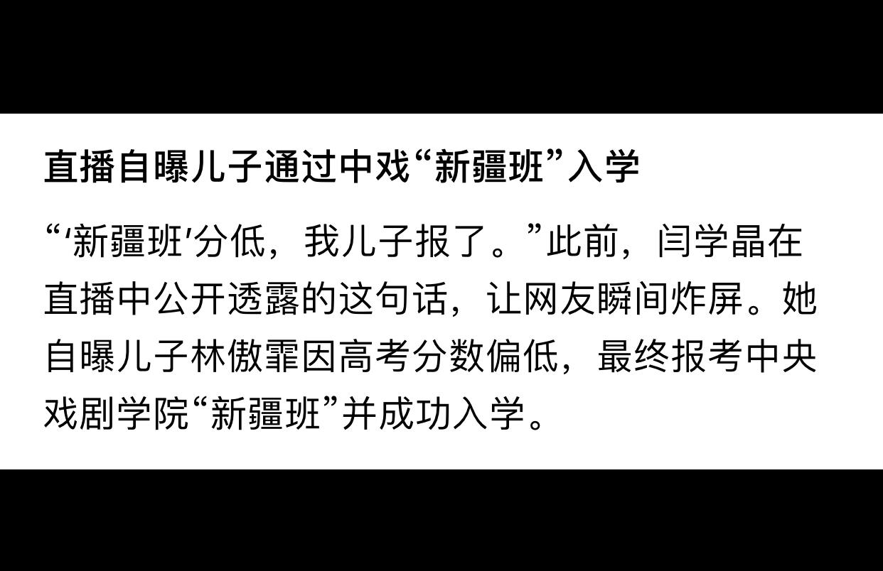 祸不单行! 瓜越吃越大! 闫学晶近段时间麻烦不断,从起初的哭穷风波到被多平台禁关处罚,现在又牵扯出其子林傲霏上中戏新疆班涉嫌高考移民的大瓜。 据传,林傲霏上中戏新疆班的事是闫学晶在直播时自己透露出来的,真是自己给自己挖坑,把自己埋了,这个瓜恐怕禁不起深究。 中央戏剧学院的新疆班,招生核心指向新疆地区少数民族艺术人才,通常要求考生具有:新疆户籍+少数民族,是特别针对边疆少数民族艺术教育的专项扶持计划,旨在培养扎根新疆的文艺骨干。这类专项班级的招生有严格的资格审核流程,包括户籍、民族身份、艺术专业考核等多重环节。 然而,闫学晶之子呢?他既不是新疆户籍也不是少数民族,可他偏偏上的就是这个新疆班,难怪网友们问:这是怎么做到的? 面对全网质疑,林傲霏仅模糊回应:网传言论不实!却未提供户籍学籍证明、新疆就读记录等关键材料,闫学晶本人也始终沉默,相关直播片段也已悄然下架。中戏至今未公示当年新疆班录取名单,教育主管部门也未给出明确调查结果。 但请注意!公众的愤怒从不是针对某个人,而是反感反对特权挤占公共资源。当边疆学子为一个升学名额拼尽全力时,手握资源的星二代却疑似绕过规则插队,这无疑是对教育公平的公然践踏。究竟是招生规则存在例外漏洞,还是审核环节有人开绿灯?期待官方给出清晰回应,或者还闫学晶之子一个清白,或者还所有考生一个公平公正的说法。