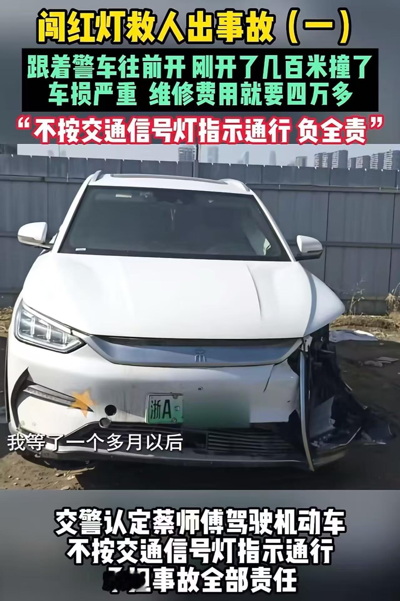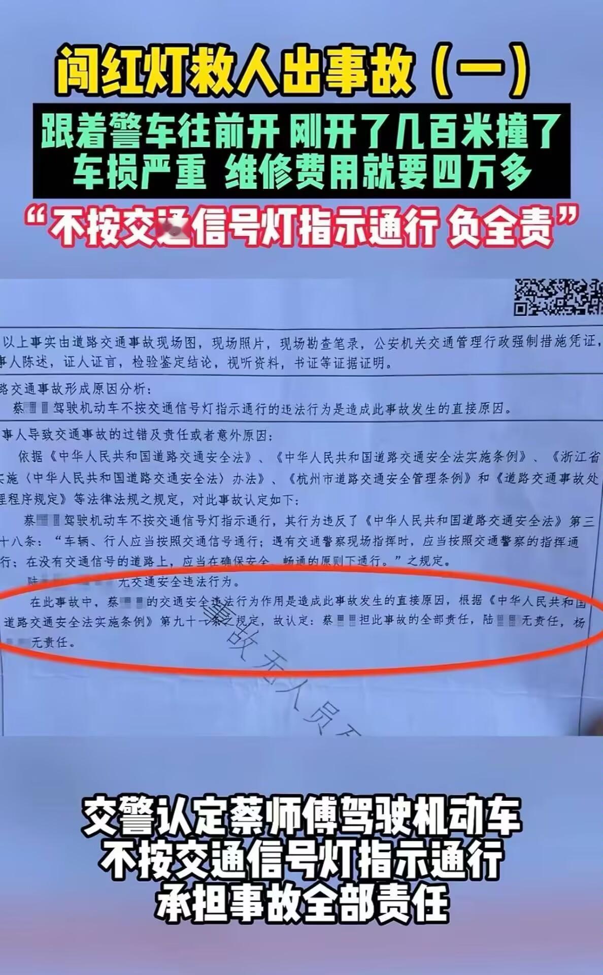 “好人难做!”浙江杭州,网约车司机送一名手指断了的乘客去医院急救,途中遇到交警请求帮忙开道,结果跟着警察刚开了几百米就撞了,交警认定网约车司机全责!司机:“难以接受,我是做好事跟着交警走,现在车损严重,维修费用高达四万多……” “师傅,赶紧送我去医院,我手指断了……” 这天,蔡师傅接单后,上车的乘客脸色惨白,手里紧紧攥着一个塑料袋,里面赫然装着一根血迹斑斑的断指。 蔡师傅二话不说,一脚油门冲出去。可正值晚高峰,一路红灯不断。眼看时间一分一秒流逝,他急得满头汗。 情急之下,他看到路边一名正在执勤的铁骑交警,立刻靠边求助:“警察同志,我车上有人断指,急需送医,能不能帮忙开个道?” 交警查看情况属实,迅速通过对讲机向上级简要汇报,随后拉响警笛,示意蔡师傅跟上! 蔡师傅心头一松,心想:有警察带队,这下能一路畅通了。 于是,在接下来的路口,他紧随铁骑,直接闯过红灯。 可就在通过一个十字路口时,意外发生了——铁骑凭借高机动性快速穿过,但蔡师傅的网约车体积大、速度慢,刚冲进路口,一辆正常绿灯通行的私家车就撞了上来。 蔡师傅的车前侧严重变形,所幸没有生命危险。 铁骑交警听到撞击声后,立刻掉头回来维护现场秩序。他迅速安排乘客重新打车前往医院,毕竟乘客的伤情刻不容缓。而蔡师傅则被留在现场,等待处理事故的交警到来。 很快,处理事故的交警赶到了现场。他们仔细询问了事情的经过,查看了现场情况后,认定蔡师傅闯红灯,应承担此次事故的全部责任。 蔡师傅当场懵了:“我是跟着警察走的!他开道我才敢闯红灯,而且是为了救人啊!怎么反倒全是我错?” 更糟的是,4S店评估维修费高达4万多元!这对于靠跑网约车为生的蔡师傅来说,无疑是一笔巨额开支。 他觉得让自己承担全部损失实在是太冤枉了,自己明明是出于好心,怎么到最后却落得这样的下场呢? 于是,蔡师傅申请了行政复核,希望能得到一个公正的结果。然而,杭州萧山交警第二次出具的认定书,依然判定蔡师傅承担事故的全部责任。 不过,交警也给出了一个方案,他们表示会为蔡师傅申请一个见义勇为的称号,并适当给予一定的补偿。 但蔡师傅并没有接受这个方案。他无奈地说:“我的损失太大了,车子坏了到现在都还没修呢,我已经四十多天没有跑车了,没有经济收入,而且保费还要上浮……” 对此,有律师分析指出:即便有交警开道,驾驶员仍负有确保安全通行的义务。法律上,并非“跟着警车就能免责”,尤其在交叉路口,必须观察横向车流,确认安全后方可通过。否则,一旦出事,责任仍在驾驶人。 这起事件着实让人唏嘘不已。蔡师傅热心助人,本是值得赞扬的善举,却因一场意外陷入了困境。 社会一边高喊“鼓励见义勇为”,一边用冰冷的“全责认定”把好人推入深渊。 蔡师傅错了吗?他错在太相信“警笛=通行证”,错在以为救人就能豁免风险。 但更大的问题在于:我们的应急机制,为何不能给“善意”留一条安全通道? 当一名普通司机冒着扣分、罚款甚至事故风险去配合警方执行紧急任务时,制度不该只甩给他一句“你没确保安全”。 既然交警主动开道、默许其跟随,就等于形成了事实上的“公务协作”——那么,由此产生的合理风险,难道不该由公共体系共同承担? 现在倒好:乘客手指保住了,交警完成任务了,可修车的4万块、停运的1个月收入、飙升的保费……全压在一个靠跑单养家的网约车司机肩上。 这不是在保护善意,是在惩罚善良。 如果每次做好事都要先签“生死状”、算清法律账,那下次再有人断指求救,谁还敢踩下那脚油门? 别让“全责认定”寒了千万普通人的心。真正的文明,不是看有多少人敢冲红灯救人,而是看制度是否敢为那个冲出去的人,兜住底。