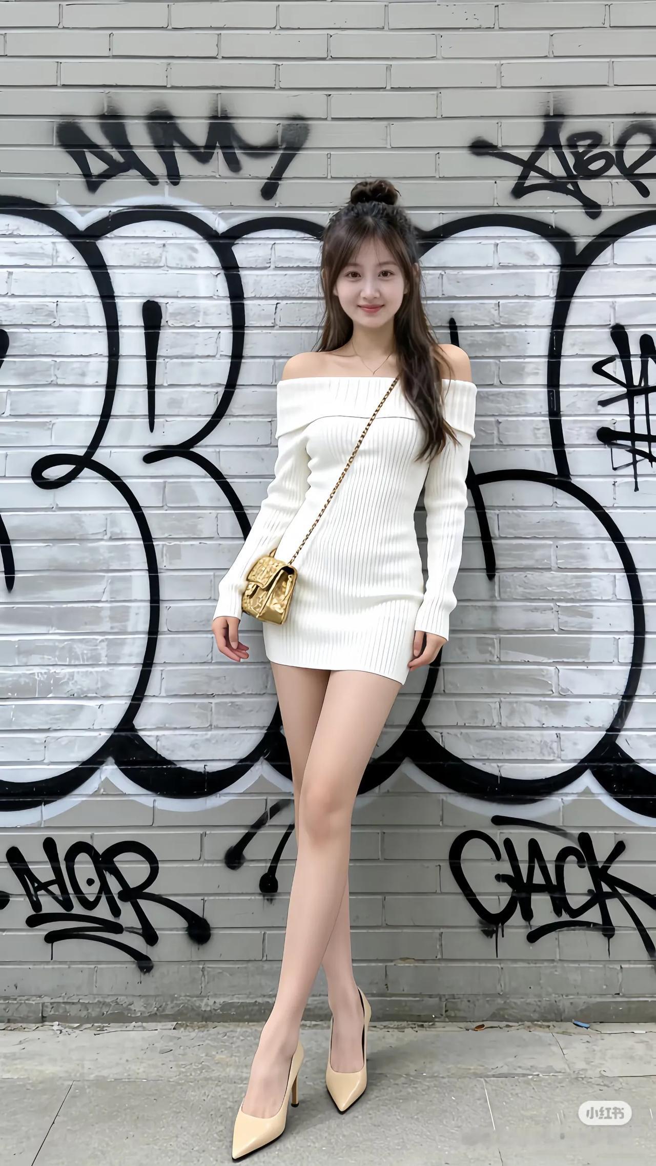 夏日清新穿搭,白色露肩上衣搭配牛仔短裤,阳光下的甜美少女街拍 高清美女