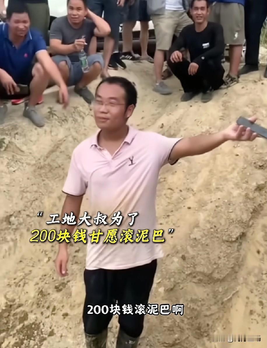 200块可以让别人做什么?还记得他吗,200块滚泥地,他滚出了“全网最实在打工人”。手机“叮”一声到账200元后,他深吸一口气,扑进泥潭,翻滚、匍匐、溅起浑黄的浪。泥水糊了满脸,他抹也不抹,只顾完成“甲方要求”——“滚够三分钟”。远处,拍摄的朋友憋着笑录视频。事后,他说这钱赚得踏实。 (图片来源于网络) 泥地打滚 耒阳泥工 北京泥工 桂林泥工 挖泥沙的小伙子