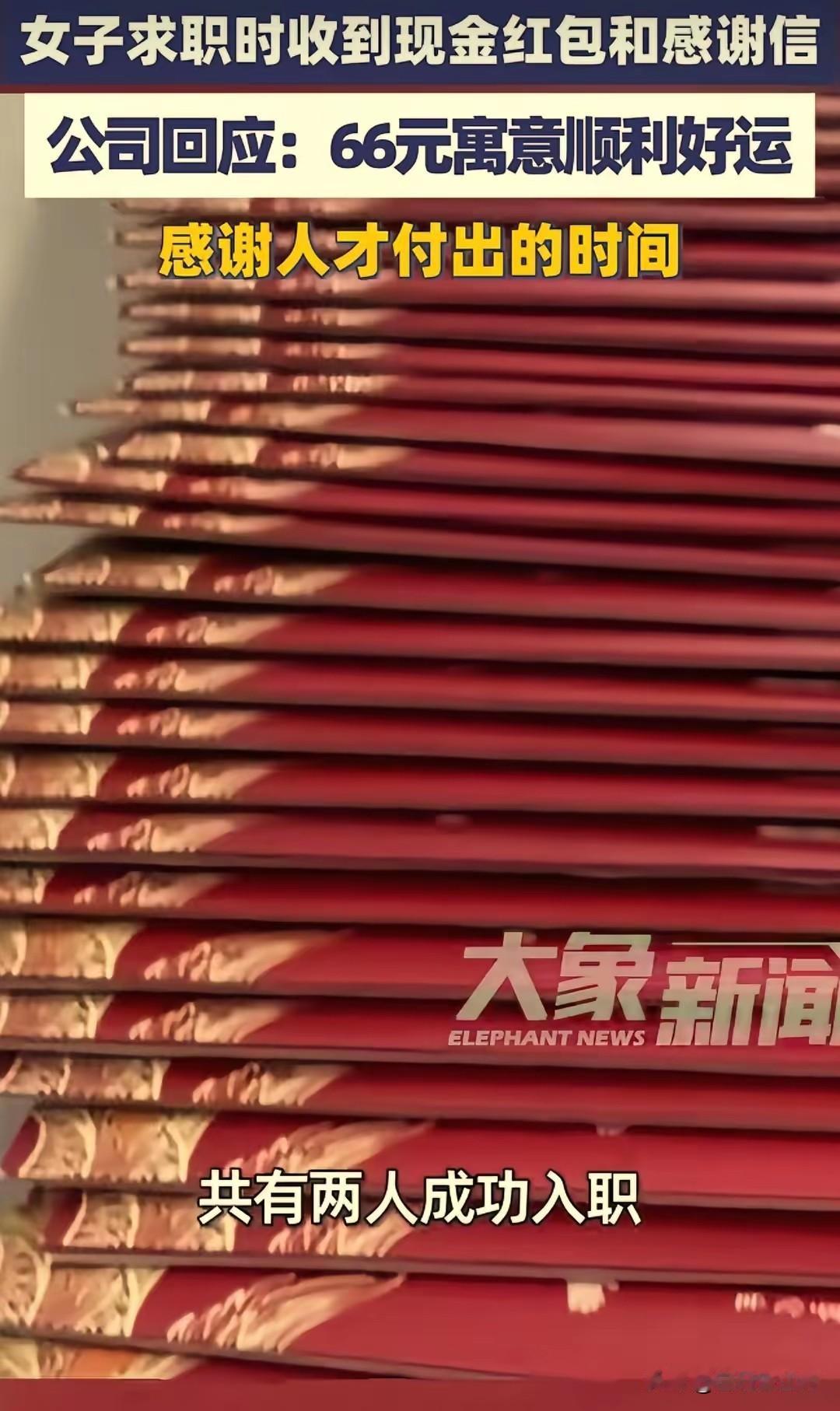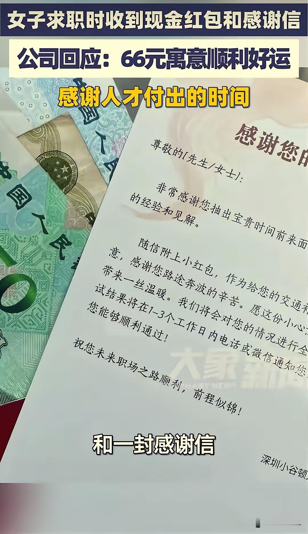 万万没想到!深圳,一女子面试工作,正准备离开时,人事却突然叫住了她,女子以为面试又要出问题,没成想人事竟然递给她一个66元的红包和一封感谢信,还说:“这是公司对人才的尊重。”女子瞬间被感动了,紧张的情绪一下子就清空了。网友:这是什么神 仙公司啊! 深圳的求职市场向来节奏飞快,不少求职者揣着精心准备的简历,在各个写字楼间奔波,每一场面试都藏着紧张与期待,这位女子也不例外。 面试前她反复核对岗位信息,对着镜子练习自我介绍,生怕哪个环节出错,一路上都在心里复盘可能会被问到的问题,手心甚至冒出了细汗。 抵达公司后,她按流程完成了面试,整个过程还算顺利,只是结束后心里依旧没底,毕竟求职路上碰壁是常有的事。 她收拾好随身物品,轻声和人事道别后便转身准备离开,想着又要开始等待未知的结果,心里难免有些失落,连日求职的疲惫也悄悄涌了上来。 就在她即将走出办公室门口时,身后突然传来人事的呼唤,她下意识停下脚步,心里瞬间揪紧,暗自揣测是不是面试中出现了疏漏, 或是对方要告知不合适的结果,紧张的情绪瞬间拉满,转身时脸上还带着几分掩饰不住的忐忑。 没等她多想,人事已经快步走到她面前,递过来一个精致的红色信封,她迟疑着接过,指尖能感受到信封的厚度,心里满是疑惑,不知道这突如其来的信封里装着什么。 她当着人事的面轻轻拆开,里面的东西让她瞬间愣住,一张折叠整齐的66元纸币静静躺着,旁边还有一封字迹工整的感谢信。 这完全超出了她的预料,她从没想过面试结束后还能收到这样的心意,要知道66元在广东有着顺顺利利的美好寓意。 这份红包不是大额的补助,却藏着最真切的祝福,感谢信里的字句满是诚意,字里行间都是对她专程前来面试的感谢,还有对她未来求职之路的美好期许,更传递着公司对每一位求职者的尊重。 连日来求职的焦虑、等待回复的不安、奔波赶路的疲惫,在这一刻好像都被这份突如其来的温暖抚平,她紧绷的神经瞬间放松下来,紧张的情绪一扫而空,心里涌上阵阵暖意,眼眶也忍不住微微发热,原本略带失落的心情,被满满的感动填满。 她后来才知道,这家公司不管面试结果如何,都会给每一位前来面试的求职者准备这样一份红包和感谢信,就是深知求职者奔波的不易,明白大家为了每一场面试付出的时间和精力,想用这样微小却暖心的举动,给求职者带去一份慰藉,传递一份尊重。 女子把这份经历分享出去后,很快引发了网友的广泛关注,大家纷纷被这家公司的暖心举动打动,感慨在快节奏的职场环境里,这样的温柔格外难得,不少人直言这简直是神仙公司,还有人表示,比起物质上的馈赠,这份被看见、被尊重的感觉,才是最珍贵的。 也有人说,职场从来都不该是冷冰冰的筛选场,一份小小的红包,一封简短的感谢信,看似不起眼,却藏着企业的格局与温度,这样懂得尊重人才的公司,注定会走得更远,毕竟每一位求职者在考察岗位的同时,也在感受着企业的文化与态度,而尊重,永远是双向奔赴的开始。 对此,你们有什么看法,欢迎评论留言~