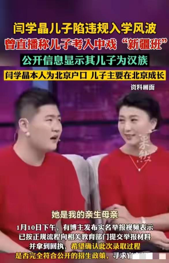 2026年1月11日,中央戏剧学院发布声明,否认演员闫某晶之子林某霏就读“中戏新疆班”的网传信息。声明称林某霏为北京户籍汉族生源,通过艺考和高考被2012级表演系普通本科班录取,且该校当年并未招收新疆班。 网友评论: 以新疆班的成绩录的,牛掰得狠 她儿子在早期一档综艺节目中说过自己是新疆班的,当时还随口说了一个新疆少数民族同学的名字。 请公布他的录取分数,以及当时中戏的招生条件和分数,要求! 亲妈亲口说的,官方不承认还是不能承认? 不对,她妈说的,然后她儿子上王维念的节目上猜人环节也说过新疆班同学事情,必须严查。
