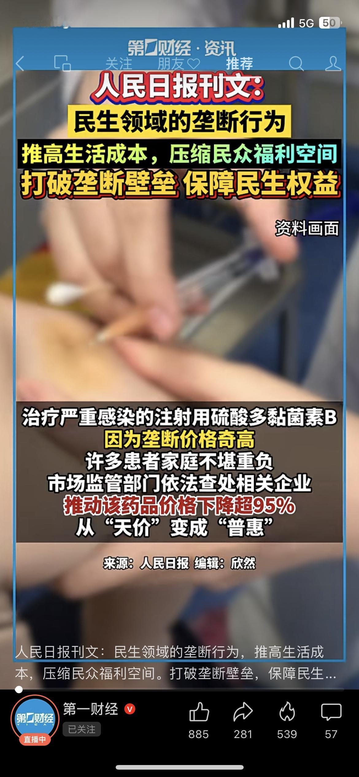 人民日报怒批民生垄断!天价药直降95%太解气了 治疗严重感染的药因垄断卖天价,患者家庭扛不住,监管出手后价格直接砍到“普惠价”。民生领域的垄断就是吸普通人的血,就该这么硬核亮剑! 你还遇到过哪些民生领域的“隐形垄断”?反垄断