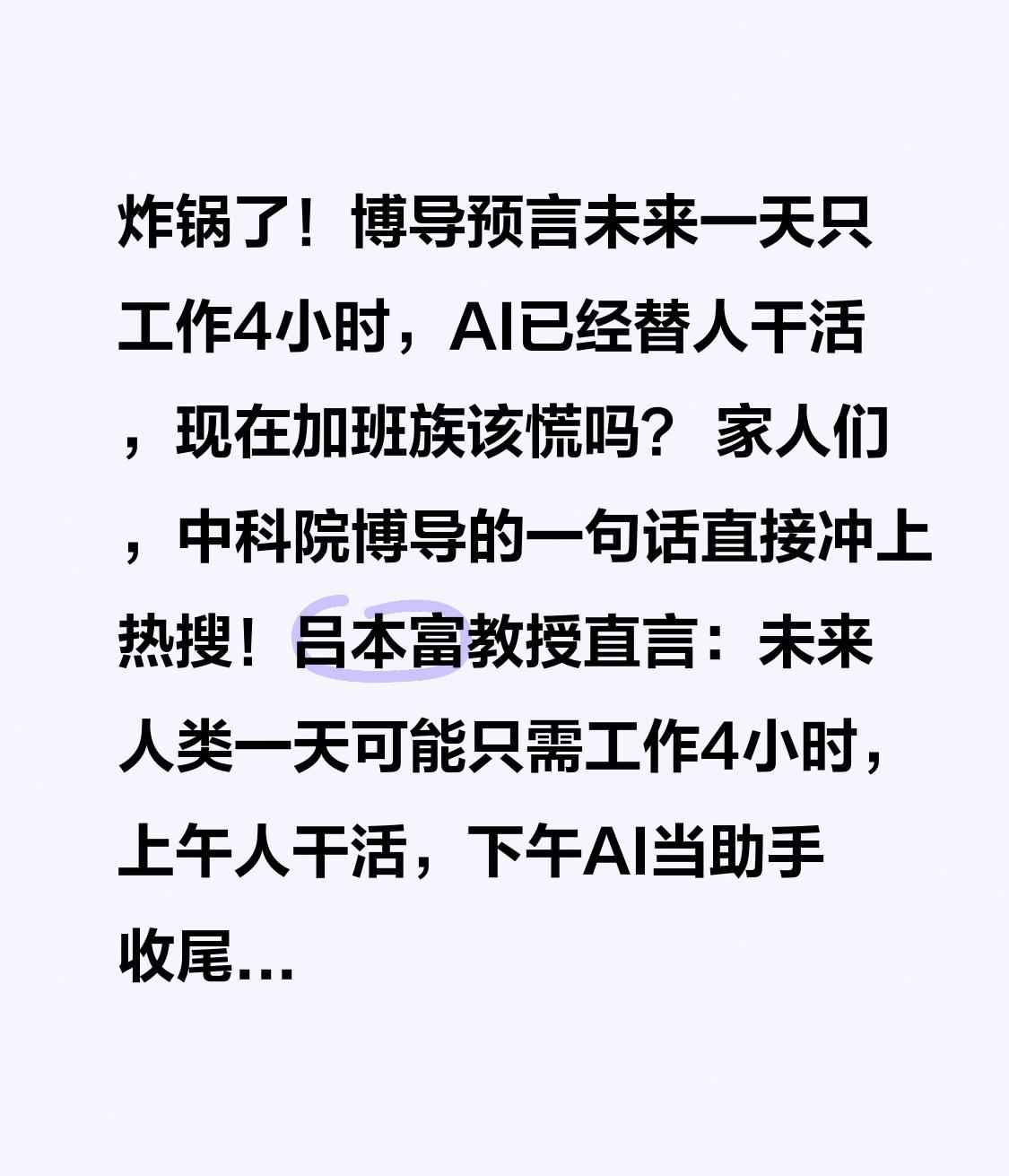 炸锅了!博导预言未来一天只工作4小时,AI已经替人干活,现在加班族该慌吗? 家人们,中科院博导的一句话直接冲上热搜!吕本富教授直言:未来人类一天可能只需工作4小时,上午人干活,下午AI当助手收尾,这到底是画饼还是马上要实现的现实?看完背后的真相,加班族狂喜又慌了! 先给大家看组真实数据:深圳福田区70名“AI数智员工”上岗后,政务效率直接逆天——过去人工4小时才能写完的劳动仲裁裁决书,现在AI辅助4分钟就能搞定,格式准确率超95%;河北唐钢的APS系统更牛,以前计划员每天花3-4小时整理生产数据,现在半小时就能核实完系统生成的最优方案,生产效率提升20%,订单交付率100% !这些不是科幻片,而是已经落地的AI提效实例,也正是博导预言的底气所在。 吕本富教授的核心逻辑很简单:AI正在疯狂替代重复劳动。就像工厂里的自动化流水线取代人工分拣,现在AI能搞定报表、文书、数据整理这些机械活,人只需要专注创意、决策、沟通这些AI干不了的事,4小时高效工作完全能顶过去8小时的产出。更关键的是,国际上已经有成功试点:冰岛推行每天7-8小时、每周4天工作制后,员工幸福感暴涨,生产效率没降反升;微软日本试点四天工作制, productivity直接提升40% ! 可反转来了,为啥现在大家还在996?现实的鸿沟比想象中残酷。2025年人社部数据显示,43%的职场人日均加班超1小时,不少人连双休都没落实,网友吐槽“单休都没普及,谈4小时工作制就是乌托邦”。更扎心的是,技术替代根本不均衡:物流分拣、编程这些规则明确的岗位,AI替代率已经高达90%,但医护、教育、创意策划这些需要人性化交互的领域,想压缩工时难如登天。 还有更现实的担忧:万一真实行4小时工作制,老板会不会要求“4小时干8小时的活”?或者直接降薪?网友的顾虑不是没道理,之前就有企业借“弹性工时”名义变相加班,要是没有制度保障,缩短工时可能变成“减薪陷阱”。更让人焦虑的是低技能劳动者的出路,AI替代后,他们该如何转型?刘强东提议征收“90%技术暴利税”反哺普通人,但这一设想目前还缺乏立法支持。 但别光顾着慌,机会也藏在变革里。博导强调,未来最核心的能力是“会用AI当助手”。就像唐钢的计划员,以前埋头做报表,现在转型做订单追踪和资源优化;京东的快递员,有人已经转岗成自动化设备运维师,收入反而更高。清华教授也给出了务实路径:先从“上四休三”试点,再逐步优化,重点是通过AI工具压缩会议、报表这些冗余劳动,让大家聚焦核心任务——其实很多人的有效工作时间,本来就只有4-6小时。 说到底,4小时工作制的核心不是“少干活”,而是AI解放人力后,让工作回归本质。我们真正该期待的,不是凭空少干活,而是用技术把人从重复劳动里解放出来,有更多时间陪伴家人、学习成长。但这需要制度配套:修订劳动法明确“工时减薪不减”,建立技能培训基金帮普通人转型,让AI带来的技术红利,能公平分给每一个劳动者,而不是只让少数人受益。 从8小时工作制取代12小时苦役,到现在AI推动工时缩短,人类的工作模式一直在进化。博导的预言不是遥不可及的梦想,而是正在发生的趋势。但变革的过程中,我们既要拥抱技术,也要守住公平底线。 你觉得4小时工作制会多久实现?现在该提前学习AI技能吗?欢迎在评论区聊聊你的看法,觉得未来可期的别忘了点赞转发,让更多人看到这场即将到来的工作革命!希望我们都能等到“高效工作4小时,快乐生活一整天”的那天!