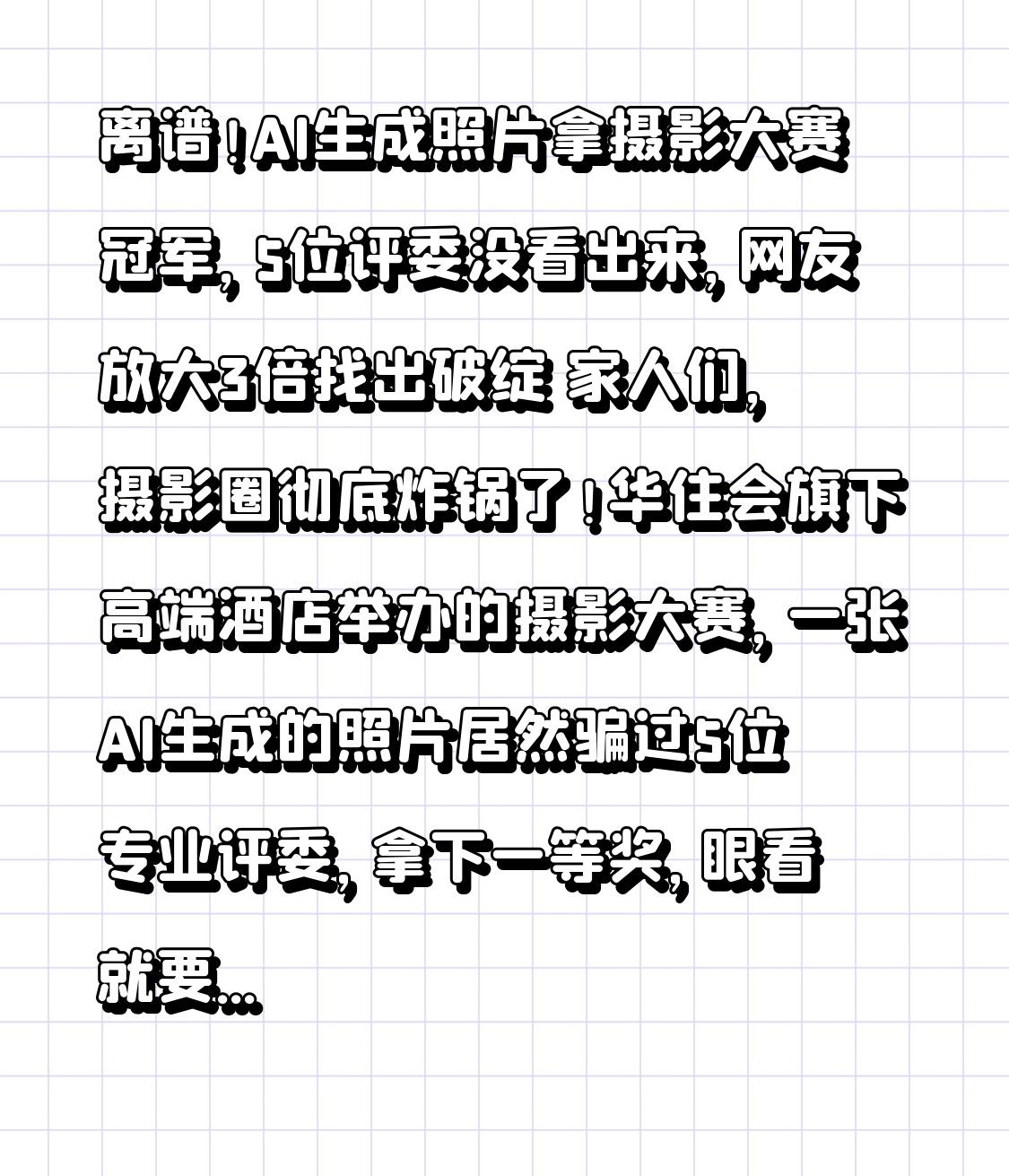 离谱!AI生成照片拿摄影大赛冠军,5位评委没看出来,网友放大3倍找出破绽 家人们,摄影圈彻底炸锅了!华住会旗下高端酒店举办的摄影大赛,一张AI生成的照片居然骗过5位专业评委,拿下一等奖,眼看就要领奖,却被网友放大3倍后找出致命破绽,直接取消资格!这到底是AI技术太牛,还是评委不够专业? 事情要从1月9日说起,这场名为“艺术MaxX·城市记忆摄影大赛”的获奖名单公示,一等奖作品《骑楼旧光》惊艳全网——光影聚焦在提鸟笼的老人身上,老巷氛围拉满,评委团里不乏协会副会长级别的大咖,给出的评价是“构图精妙,充满生活质感”。可就在颁奖前夕,有网友不死心,把图片拉高曝光、放大3倍,瞬间让AI的“马脚”无所遁形! 右侧的店铺牌匾文字错乱不全,根本不是真实汉字;老人提鸟笼的手指和手掌居然是断开的,关节扭曲得不符合人体结构;更离谱的是左侧连续出现两个一模一样的凉茶铺牌匾,连细节纹理都分毫不差 !这些都是AI生成图片的典型漏洞,懂行的人一眼就能看穿,可5位专业评委愣是没发现,网友直呼“这评审比AI还敷衍”。 更让人震惊的是,这根本不是孤例!福建旅游发展集团主办的摄影大赛上,一等奖作品《湖秋雾影》也被扒出是AI生成——树叶纹理“过度平滑”,没有真实光照下的细微差异;建筑边缘扭曲失真,窗户轮廓歪歪扭扭,墙面上的文字清晰却无法辨识,完全符合AI的创作逻辑漏洞。而这两场比赛,都明确规定“禁止AI生成作品参赛”,结果还是让AI作品一路过关斩将。 反转来了,面对网友质疑,华住会主办方紧急核查后,宣布取消《骑楼旧光》的获奖资格,理由是“不符合原创性规则” 。可福建那场比赛的主办方,却迟迟没有给出明确结论,只说“正在综合评定”,连评委名单都不愿公开,引发网友强烈不满:“规则写得明明白白,违规了还拖着不处理,是想不了了之吗?” 其实AI照片能蒙混过关,核心问题出在评审机制上。现在多数摄影比赛还靠评委“肉眼审图”,缺乏专业的AI检测工具,也不强制要求参赛者提供包含拍摄参数的原始文件(RAW文件),给了作弊者可乘之机。有AIGC专业人士直言,用Illuminarty这类检测工具,结合区块链溯源技术,就能轻松甄别AI作品,可很多主办方为了省事,连最基础的筛查都懒得做。 更关键的是,行业规则还存在巨大模糊地带。有的比赛完全禁止AI,有的则允许AI辅助后期,还有的像中国第19届国际摄影展,直接对创作技法不设限制,只要原片是本人拍摄就行 。这种混乱的规则,不仅让参赛者无所适从,也给评委评审带来了极大难度。 网友们的愤怒,根本不是反对AI技术,而是反感“用AI作弊”的行为。那些背着相机走街串巷、蹲守十几个小时捕捉光影的摄影师,拼不过别人几秒钟输入关键词生成的图片,这对真实创作者太不公平了。摄影的核心价值是“捕捉真实瞬间”,AI可以模仿光影构图,却永远复制不了人类对生活的观察和情感的注入。 现在越来越多的人呼吁,摄影比赛必须革新评审规则:强制要求提交原始文件和拍摄参数,引入专业AI检测工具,建立“技术筛查+专家复审+公示质疑”的多级审核流程,一旦发现AI作弊,不仅要取消奖项,还要把参赛者拉入行业“黑名单”,增加违规成本。只有这样,才能守住摄影艺术的真实性底线,不让真实创作者寒心。 AI技术的发展是趋势,我们不应该一味抵制,但必须明确边界。摄影比赛可以为AI开辟独立赛道,让AI作品和实拍作品公平竞争,而不是让AI作品混进实拍赛道作弊。艺术的价值在于原创和真诚,任何靠技术投机取巧的行为,都不会被真正认可。 希望这两场AI作弊事件,能给所有摄影比赛敲响警钟,尽快完善规则、补上漏洞。如果你支持严惩AI参赛作弊,守护摄影艺术的纯粹,别忘了点赞转发,让更多人关注这件事!你觉得AI作品应该允许参加摄影比赛吗?欢迎在评论区聊聊你的看法!