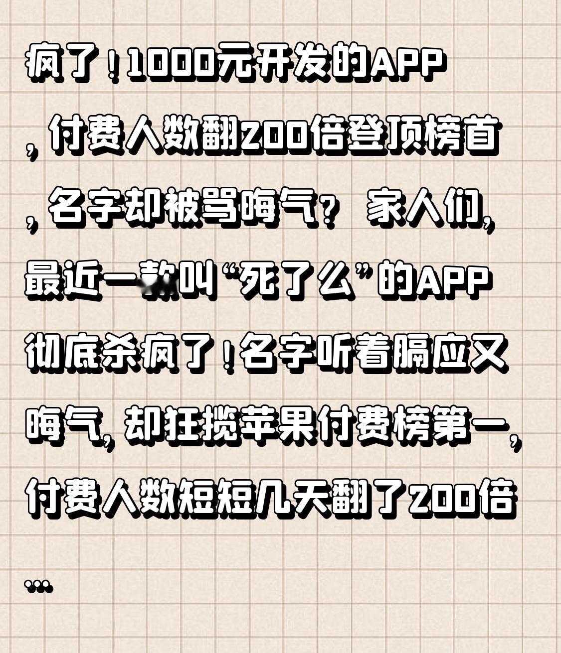 疯了!1000元开发的APP,付费人数翻200倍登顶榜首,名字却被骂晦气? 家人们,最近一款叫“死了么”的APP彻底杀疯了!名字听着膈应又晦气,却狂揽苹果付费榜第一,付费人数短短几天翻了200倍,3个95后远程兼职开发,1000多块成本就实现盈利,甚至敢100万出让10%股份,估值飙到1000万!这到底是收割焦虑,还是真刚需? 说出来你可能不信,这款爆火的APP,核心功能简单到极致:不用注册登录,预设紧急联系人邮箱,每天手动签到,连续两天没打卡,系统就自动发预警邮件。8块钱买断终身使用,不收集定位,不读取通讯录,就靠这“粗暴”的逻辑,戳中了1.25亿独居人群的痛点——怕自己出事没人知道。 可爆火的同时,争议也炸了锅!首当其冲就是这个名字,网友吵翻了天:有人说“每天打开都像在咒自己,太晦气了”,呼吁改成“活着么”“平安签”;也有人觉得直白才管用,“直面生死不是不敬,是对安全的重视”。更有意思的是,苹果官方都被惊动了,客服回应说“可协调开发者改名”,但团队硬刚到底:暂时不考虑改,直面死亡才是核心价值 。 反转还不止这些!就在大家争论名字时,竞品已经悄悄冒头。另一款叫“亲安心”的APP,走温情路线,不用手动签到,靠手机传感器自动监测用户是否活跃,还能分析离线原因是没电还是飞行模式,零学习成本对老人更友好。一边是硬核直白的“死了么”,一边是润物无声的“亲安心”,网友调侃“独居安全赛道卷起来了”。 但“死了么”能爆火,绝非只靠名字博眼球。背后是扎心的社会现实:我国“一人户”家庭超1.25亿,独居青年、空巢老人越来越多,“孤独死”的新闻屡见报端。传统安防设备又贵又复杂,而它8块钱的定价、极简的操作,刚好填补了轻量化安全工具的空白。有用户直言:“虽然名字膈应,但作为独居者,这是最实在的数字兜底” 。 不过问题也很明显:仅支持邮箱通知,对不会用邮箱的老人不友好;手动签到容易忘,可能引发乌龙预警;还有用户担心隐私泄露,质疑“真能保护安全吗”。面对这些吐槽,团队也在加急优化,短信通知功能本月就会上线,还计划推出适配中老年人的专属版本,甚至考虑增加智能手环联动监测生理体征的功能 。 更让人意外的是它的创业故事:3个95后远程协作,开发时间不到一个月,初始成本就1000多块,最初定价1块钱,后来因为服务器扩容、第三方服务付费,才涨到8块。创始人说,没想过会这么火,增长全靠网友自发裂变,争议越大,传播越广,现在每天都在忙着扩容服务器,应对暴涨的流量 。 其实这场争议的背后,是独居人群被忽视的安全感需求。“死了么”的爆火,不管是名字争议还是功能吐槽,本质上都是大家对安全的重视。它可能不完美,但让更多人关注到独居群体的困境,推动安全工具更接地气,这就是它的价值所在。 随着家庭安防市场规模预计2030年突破千亿美元,独居安全赛道只会越来越火。但不管是“死了么”还是“亲安心”,能真正解决用户需求、守住安全底线,才是长久之道。毕竟对独居者来说,名字好不好听不重要,能不能在关键时刻传递信号,才是核心。 你觉得“死了么”该改名吗?如果是你,会选硬核的它还是温情的竞品?欢迎在评论区聊聊,觉得独居安全该被重视的,别忘了点赞转发,让更多人关注这个被忽视的痛点!愿每个独居的人,都能被安全守护,不用在孤独中担忧风险!