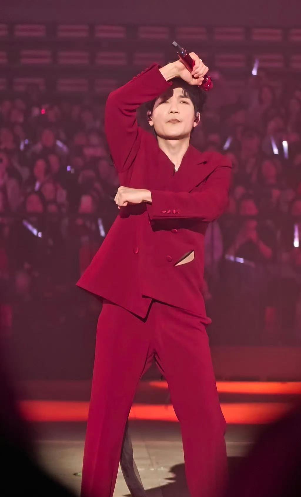 陈楚生深圳演唱会上这套红西装是镂空的,看得出来服装师尽力了[笑哭]! 这套海南小辣椒的西装,昨天看还以为那是一个斜兜,今天才看清楚原来是镂空的,跳舞的时候看到肉了,原谅我看的太仔细了[笑哭]! 深V,胸部洒金,没有内搭,腰部镂空 小心思还是蛮多的, 陈楚生的衣服好多[大笑]!陈楚生西装