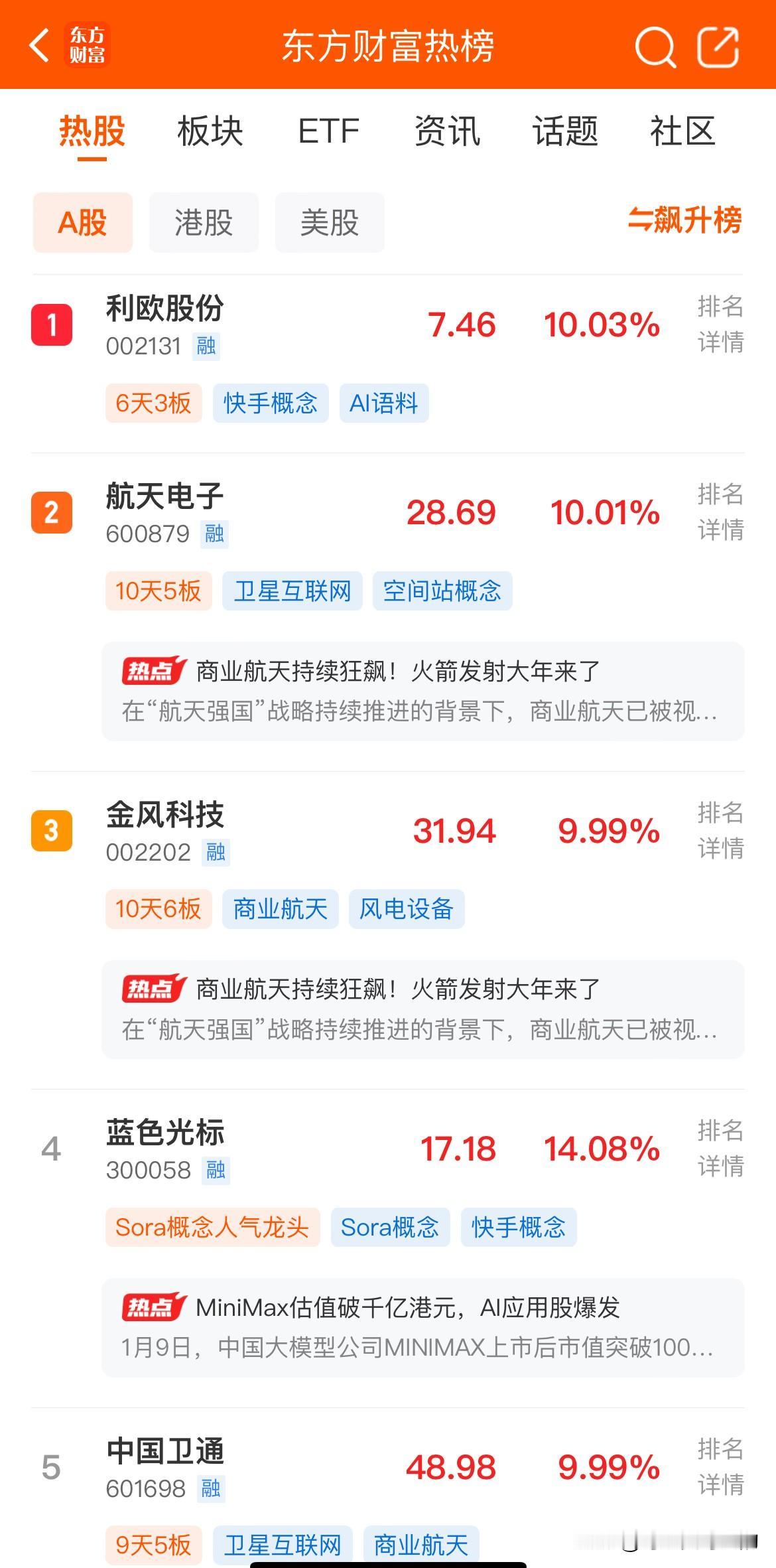 明天又要开盘啦!看看今天东财热股榜都是哪些股! 1、利欧股份,6天3板,AI应用 2、航天电子,10天5板,商业航天 3、金风科技,10天6板,商业航天 4、蓝色光标,6天涨幅78.96%,AI应用 5、中国卫通,9天5板,商业航天 6、中国卫星,商业航天中军控异动 7、岩山科技,5天4板,脑机接口+AI 8、乾照光电,20cm两连板,商业航天 9、昆仑万维,周五20cm涨停,AI应用 10、美年健康,周五涨停,AI智能体+AI制药 从这份榜单可以看出,以前商业航天一家独大的局面已不再,目前商业航天和AI应用已经是各占半壁江山了,而且AI应用大有要抢班夺权的架势。 不过本周末商业航天的利好也很多,但是很多人已经在看衰商业航天,毕竟短期涨幅已经很大了,因此各位股民也要注意风险。 那么明天究竟是商业航天强者恒强,继续稳坐头把交椅,还是AI应用成功抢班夺权,我们拭目以待!