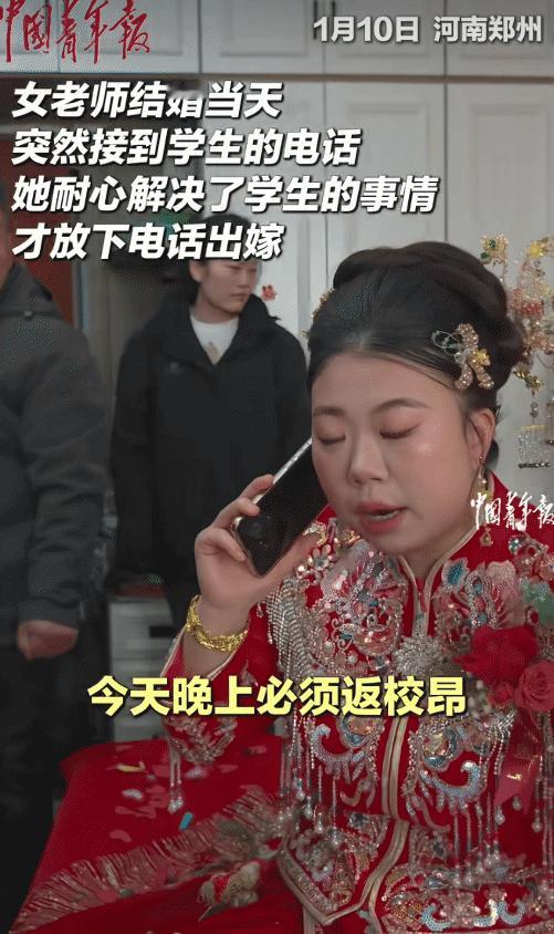“太敬业了!”河南郑州,女老师结婚当天,学生突然打来电话。没想到,她接了电话,耐心地解决了学生的事情,才放下电话出嫁。 原来,这位女子是一名老师,当天是她结婚的日子。然而她在自己房间等着新郎来接亲,当新郎到了后,她的手机突然响了。 她拿起手机一看,是学生的电话,她立马就要接,她妈妈说: “这啥时候了,还接电话。”她说: “要接的。”她说着就接通了电话。 原来是她的学生给她打电话请假,她在电话里跟学生说: “今天晚上必须返校,你俩请假请到啥时候,他出去干啥,也今天晚上必须返校。” 然后她说完,才把电话挂了。当时摄影师看到这一幕后,就觉得这新娘太敬业了。 这一幕让网友们称赞这新娘是个负责任的好老师。 有网友说: 这位老师太敬业了,她工作之余抽空结个婚。 也有网友说: 新娘接电话那一刻,气场一下就上来了。 还有网友说: 别人听见老师这语气,现场的人都不敢乱动了! 确实看到这位女老师在出嫁时,还接学生的电话,真的是敬业。这也是因为教师的工作从来不止于课堂,她接这通电话是一个老师对学生的那份责任,所以即便在自己最重要的日子,学生的一个电话依然能让她立刻进入“老师”的这个角色。 就像她妈妈催她,但她却坚定地告诉她妈妈,这个电话要接。这就教育是心与心的连接,学生打来电话时,或许正需要那一声及时的指引。 所以,这位老师用她的行动诠释了什么是“学高为师,身正为范”,责任没有假期,关爱不分时辰。 同时她在电话中并非简单准假,而是明确纪律要求,这份“严爱”正是教育的真谛。 嫁衣在身,心系学子,这一刻她身上闪耀着师者仁心的光芒。 当然,我们也希望每一位敬业老师都能被温柔以待,在奉献的同时亦能享受自己的人生时刻。 而这位新娘的举动,让我们看见教师群体最动人的模样,那是一种刻进骨子里的责任感,是无论身处何地都放不下的牵挂。 最后,祝福这位老师新婚快乐!而教育无小事,师爱润无声,为所有默默奉献的教育工作者点赞! (来源: 中国青年报)