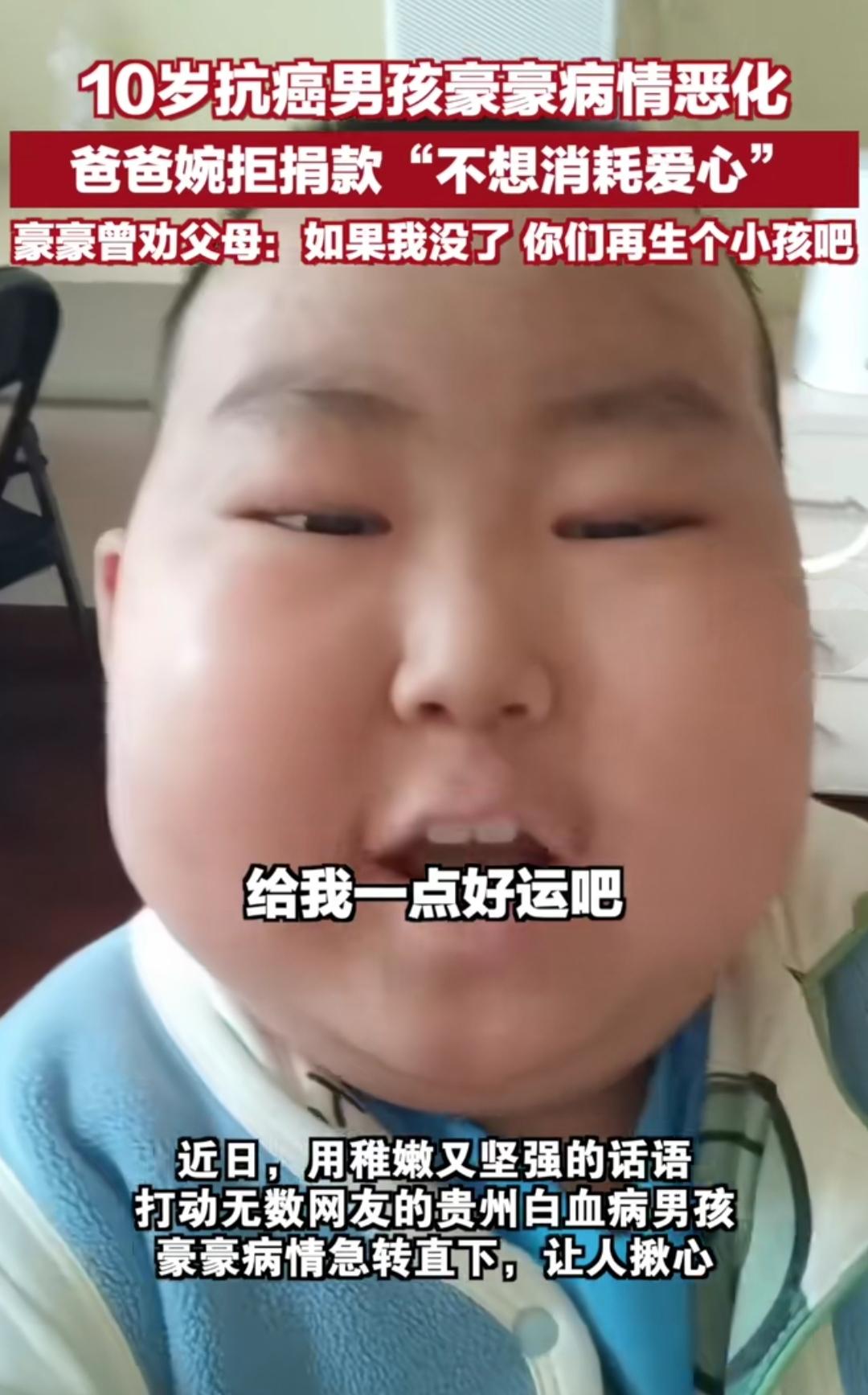 谁还记得那个喊着“王子请恢复健康”的贵州男孩豪豪?10岁的他已抗癌5年,熬过17次化疗、2次骨髓移植,挺过元旦的紧急抢救后,病情还是急转直下,如今正与死神艰难赛跑。 全网得知消息后,爱心潮水般涌来,转账和慰问留言刷满屏幕,可豪豪爸爸红着眼眶婉拒:“没治疗希望了,不想消耗大家的爱心”。他偷偷拉黑孩子账号,用谎言守护豪豪对出院的憧憬,只想让他最后的日子少些痛苦、多些温暖陪伴。 有人赞这是对善意的尊重,守住了做人的体面;也有人惋惜,觉得该抓住一切机会再试试。5年里豪豪用笑容治愈无数人,爸爸用骨气扛下所有。这份绝境中的选择,是对生命的敬畏,还是该为爱妥协?