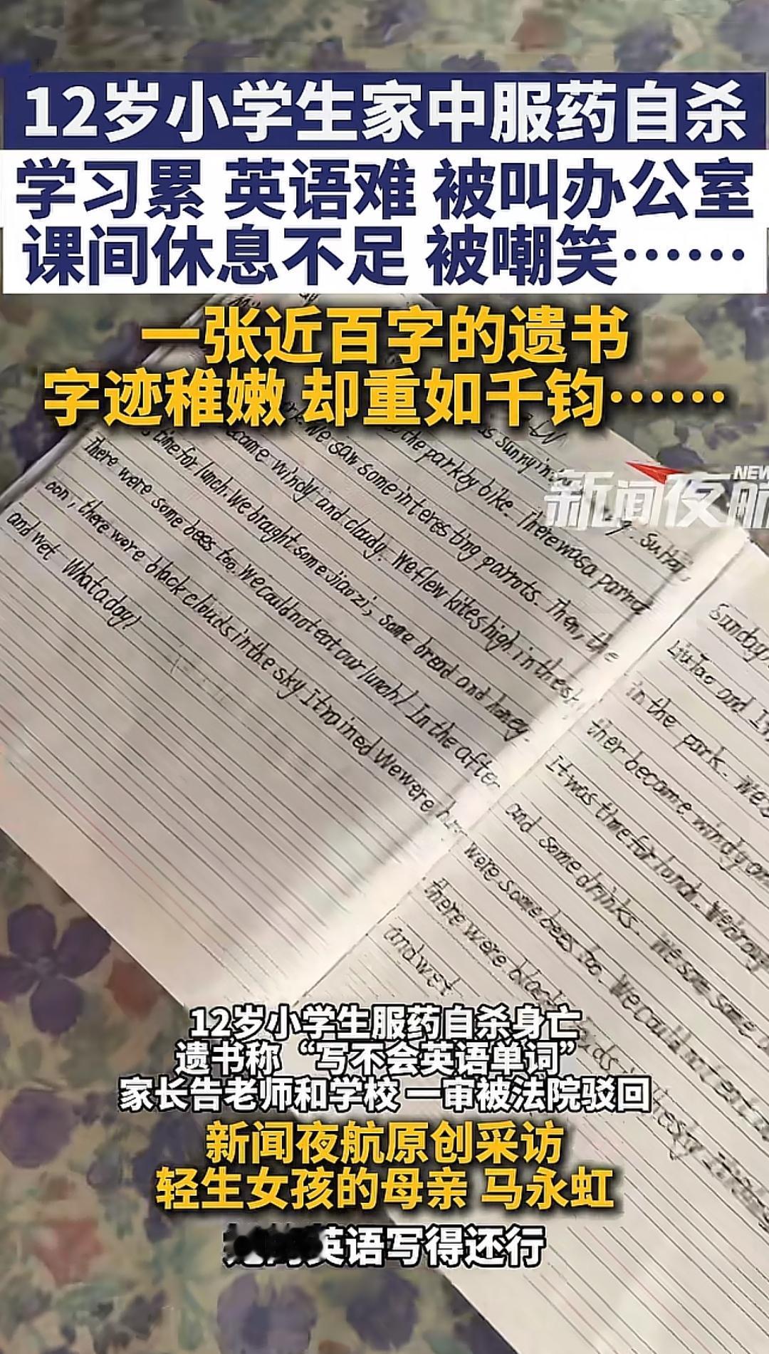 一张皱巴巴的遗书,12岁女孩小许写下“别救我”,这三个字像针一样扎进无数家长心里。学习累、英语难、被叫办公室、课间休息不够、还被同学嘲笑……短短百字,藏着她压垮骆驼的最后一根稻草。 妈妈说她英语写得挺好,可遗书上偏偏写着“一直写不会的英语单词”。刚转学没几天的她,在家吞下100粒药,就这么永远离开了。谁能想到,那个在妈妈眼里活泼开朗的孩子,会被学习压力逼到走投无路? 法院驳回了家长对学校和老师的诉讼,但这张遗书背后的教育痛点,真的能就这么算了吗?孩子的心理健康,我们是不是真的关心太少了?有人说该减轻学业负担,有人觉得要关注孩子情绪,你怎么看?