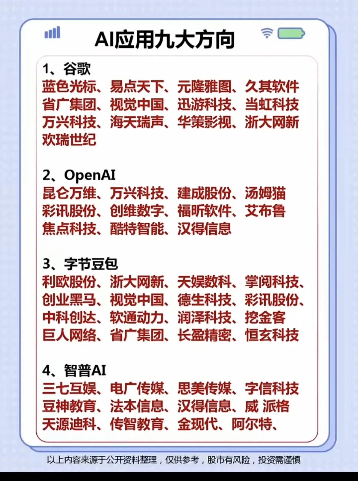 1月11日,下周A股这个板块有望大爆发!!! AI和机器人很有可能会接棒商业航天板块,成为市场引领新龙头,AI板块:谷歌板块:蓝色光标、易点天下、久其软件;OpenAI板块:重点关注:昆仑万维、汤姆猫、汉得信息;字节豆包:重点关注:利欧股份、润泽科技、软通动力!!!