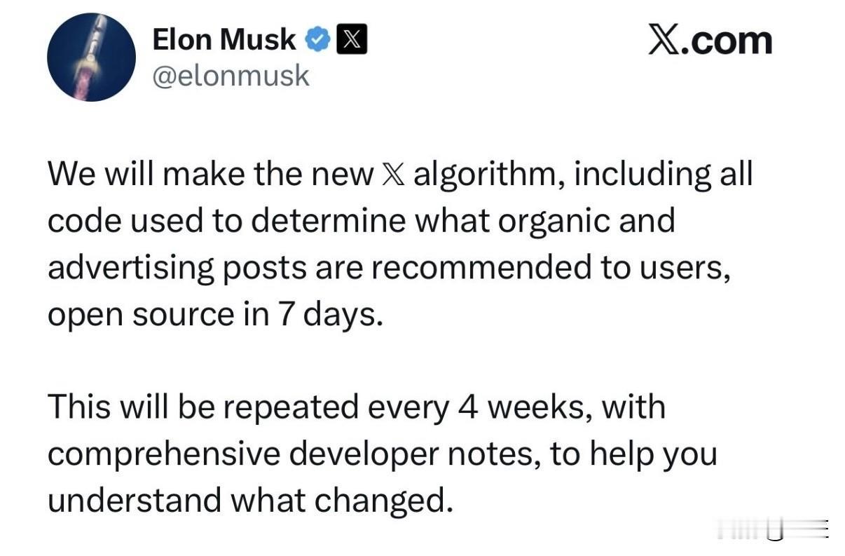 马斯克于2026年1月10日宣布,将在7天内开源𝕏平台最新推荐算法,包括自然内容和广告推荐的全部代码,并承诺每4周更新一次。 根据马斯克在X平台的官方声明,此次开源将包含: 完整代码覆盖:包括决定用户看到哪些自然帖文和广告的全部算法。 定期更新机制:每4周发布一次更新版本。 开发者文档:每次更新附带详细说明,标注具体算法逻辑变化。 值得注意的是,这并非𝕏首次开源算法。2023年Twitter时代曾开源过部分推荐代码,但相关GitHub仓库长期未更新,多数文件停留在初始版本。 马斯克 世界首富马斯克 特斯拉马斯克 马斯克AI计划 马斯克AI 埃罗尔.马斯克 伊隆·马斯克