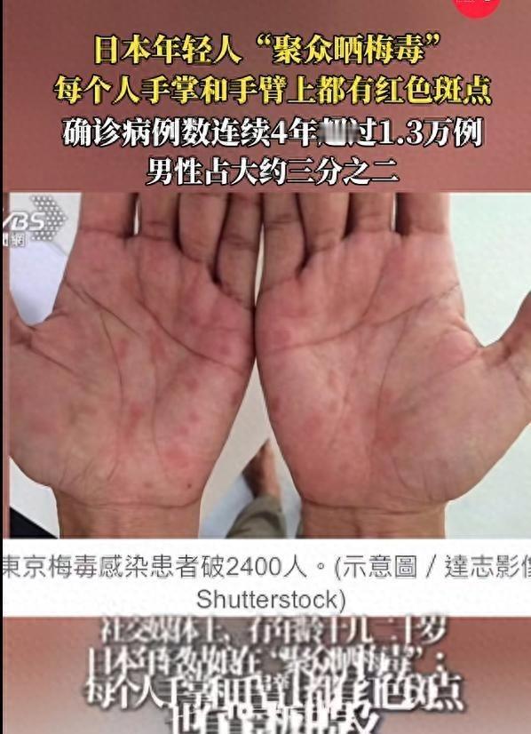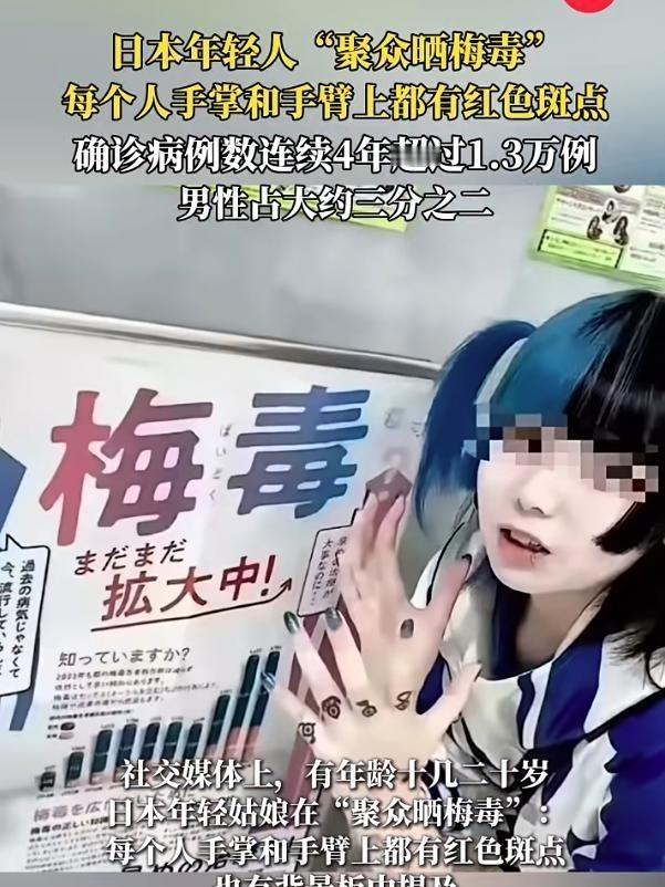 日本年轻女孩集体晒梅毒!真是时代变了,连梅毒都成了可以炫耀的事。最近日本社交媒体上流传的一幕让人大跌眼镜,六七个十几二十岁的年轻姑娘围成一圈,齐刷刷伸出手臂,手掌和胳膊上全是显眼的红色斑点,竟然在公开“晒梅毒”。 日本梅毒感染人数从2013年的1000多例起步,到2021年接近8000例,此后急剧攀升。2022年达到1.3万例,打破1999年以来纪录,2023年进一步升到1.5万例,创下历史峰值。2024年录得1.4663万例,2025年截至12月17日已达1.3085万例,东京占全国总数的25%。男性病例占三分之二,年龄从20岁到60岁以上均有增长,女性则主要集中在20多岁群体。 国立感染症研究所数据显示,这种增长与城市化密切相关,大阪、爱知、福冈和神奈川等地区病例紧随东京。卫生部门分析指出,早期症状如生殖器溃疡或口腔肿块常被忽略,导致延误诊断。专家强调,梅毒螺旋体可通过性接触传播,孕妇感染还会影响胎儿健康,造成先天缺陷或流产风险增加。社会调查显示,许多感染者通过日常体检才发现问题,公共卫生系统面临压力。 年轻女性感染率上升23倍,从2010年代中期开始显现。东京病例激增七倍,部分源于性服务行业,但数据表明30%感染者与该行业无关。约会应用和社交软件普及,让陌生人快速匹配,性行为频率升高,却缺少防护措施。国立感染症研究所报告称,2025年女性20岁段病例占比近六成,许多人从朋友闲聊或成人网站获取知识,缺乏科学指导。 卫生专家指出,初期无痛症状让感染者继续活动,加速病毒扩散。二期梅毒出现红斑时,传染性最强,这些女孩展示手臂斑点行为加剧潜在风险。厚生劳动省呼吁民众使用避孕套,并在公共健康中心提供免费检测。2022年一项调查显示,每200名孕妇青少年中有一人感染,六年内增长近三倍。平台算法推动内容传播,畸形潮流如画梅毒妆跟风,进一步扭曲健康认知。 疫情扩散根源在于性健康教育缺失。日本从2011年起病例渐增,2021年突然激增,部分因疫情后社交恢复。厚生劳动省数据表明,异性传播为主,男性多为中年群体,女性年轻化趋势明显。专家分析,城市夜生活场所增多,酒吧和派对成为接触点,防护意识薄弱。2023年先天梅毒达37例,创纪录,反映母婴传播链条未断。 公共组织举办讲座,分发宣传材料,讲解病毒途径和治疗方法。抗生素如青霉素有效,但再感染风险高,需要定期筛查。2025年血库服务加强捐血者检测,避免污染。学校体系开始纳入性教育课程,学生通过教材了解症状和预防。平台管理者删除有害帖子,优先推送健康视频,减少模仿账号。整体防控依赖个人责任,忽略健康底线会放大社会成本。 这些年轻女孩多生活在东京或大阪,从高中毕业后进入职场,面对作息压力,转向手机应用寻求放松。匹配陌生人后,短暂交往常见,防护用品常被遗忘。知识来源单一,朋友传言或在线视频主导,导致风险评估偏差。男性感染者年龄跨度大,推动病毒在群体间流动。2013年低位起步,逐年积累,到2022年破万。城市环境助长趋势,夜店和公园成为约见场所。 感染后初期无迹象,继续上传动态,直至斑点出现仍未求医。疫情报告显示,东京病例占四分之一,其他地区跟进。专家指出,社交软件加速接触频率,缺乏筛查机制加剧问题。卫生部门设立热线,接听咨询,记录信息。防控措施扩展到社区活动,分发免费用品。女孩行为反映教育空白,把症状当作符号分享,忽略神经和心血管损害。 这些女孩举动引发热议,用户转发讨论危害。平台开始规范,推动健康信息。2025年11月病例12587例,全年超1.3万。专家分析,约会app延长传播链。感染者常关节痛后求诊,医生处方抗生素。部门发布报告,呼吁使用防护。社会观念偏差,把自由当成放纵,忽视责任。初期症状不明显,无痛感导致忽视。公共危机警示全球,健康关乎社会大局。性教育需纳入体系,建立检测网。文化背景下,尊重生命是底线。平台责任重大,推送知识,规范行为。普通人树立健康观,做好防护。