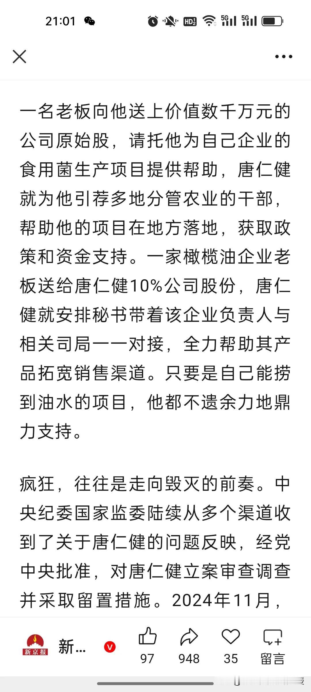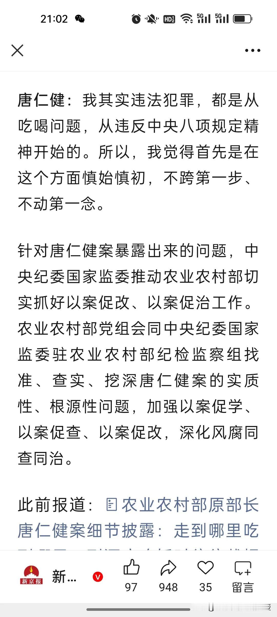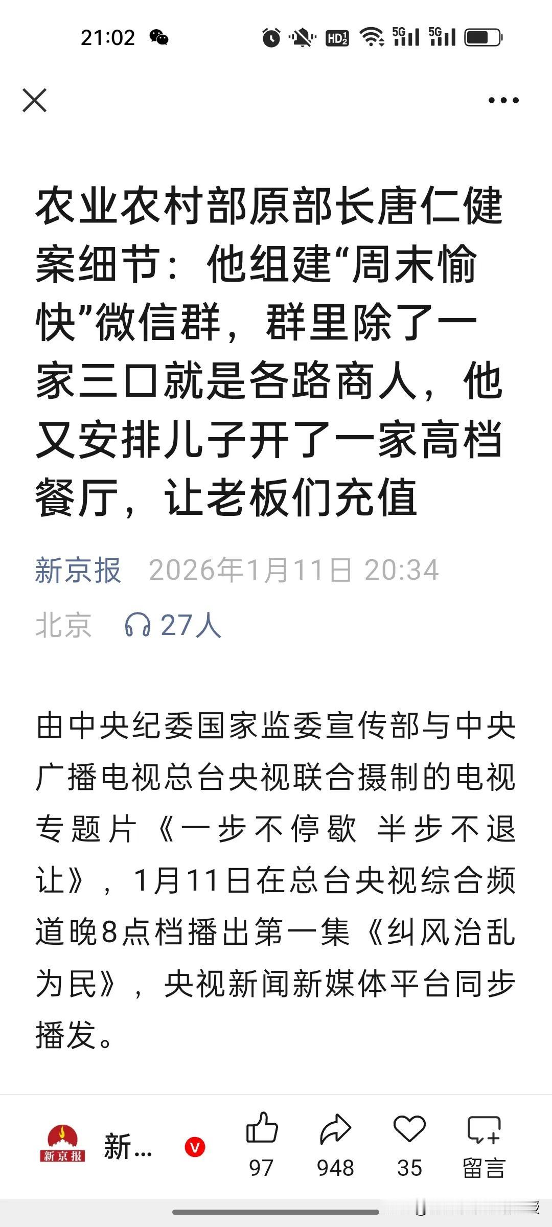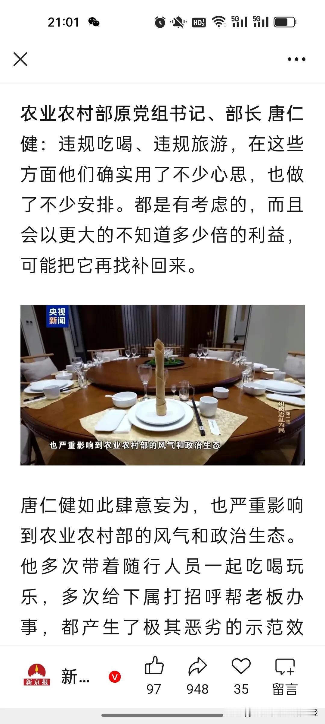 农业农村部原部长唐仁健真的就是隐性腐败的典型!今天在央视播出的反腐大片第一集《纠风治乱为民》,里面讲到了一个重要的贪腐细节,唐仁健儿子在农业农村部附近开了一家会员制高级餐厅,他一家三口和商人门有一个群,叫“周末愉快”,里面的老板都会去餐厅几十万地充值,每周末吃饭也都去那里消费,还会另外开一万多一瓶的酒,看似是餐饮消费,实则就是变相受贿,唐仁健过生日也会收红包,大钱小钱都不放过,唐仁健坦诚地说,自己的违法犯罪就是从违反中央八项规定精神开始的。 去年底,中央纪委办公厅、国家监委办公厅印发1.《调查新型腐败和隐性腐败问题证据指引》,聚焦取证难、定性难,提供20余种隐形腐败情形的取证标准,是查处实操核心文件。 去年11月在二十届中央纪委四次全会公报中也提到这样一句话:部署破解新型与隐性腐败发现、取证、定性难题,要求同查同治风腐交织,强化大数据赋能监督。 ​ 再结合今天的反腐纪录片第一集的内容,​这充分表明反腐已迈入深水区,隐形腐败的“隐身衣”正被制度利剑与科技赋能层层戳破,风腐同治的高压态势让任何变相贪腐都无处遁形。