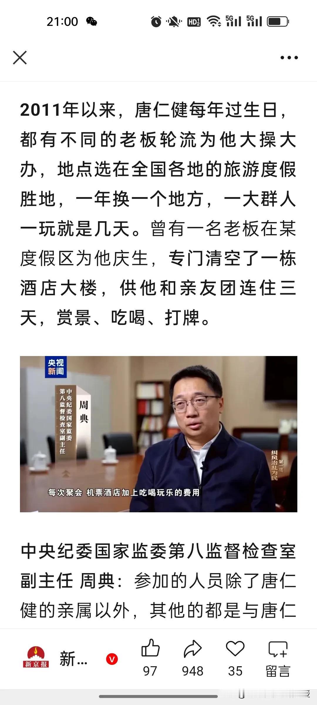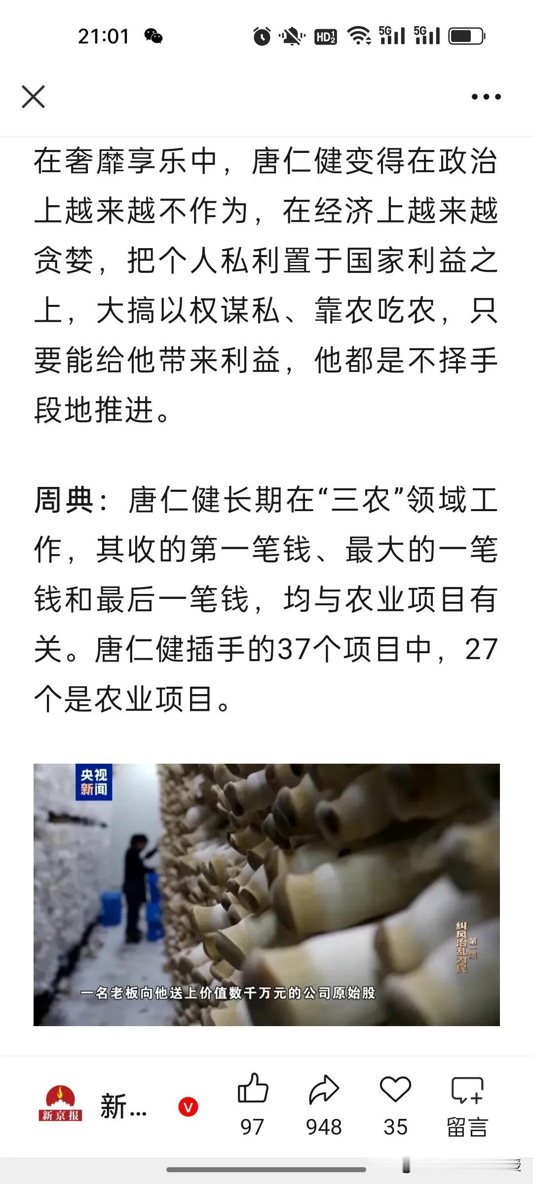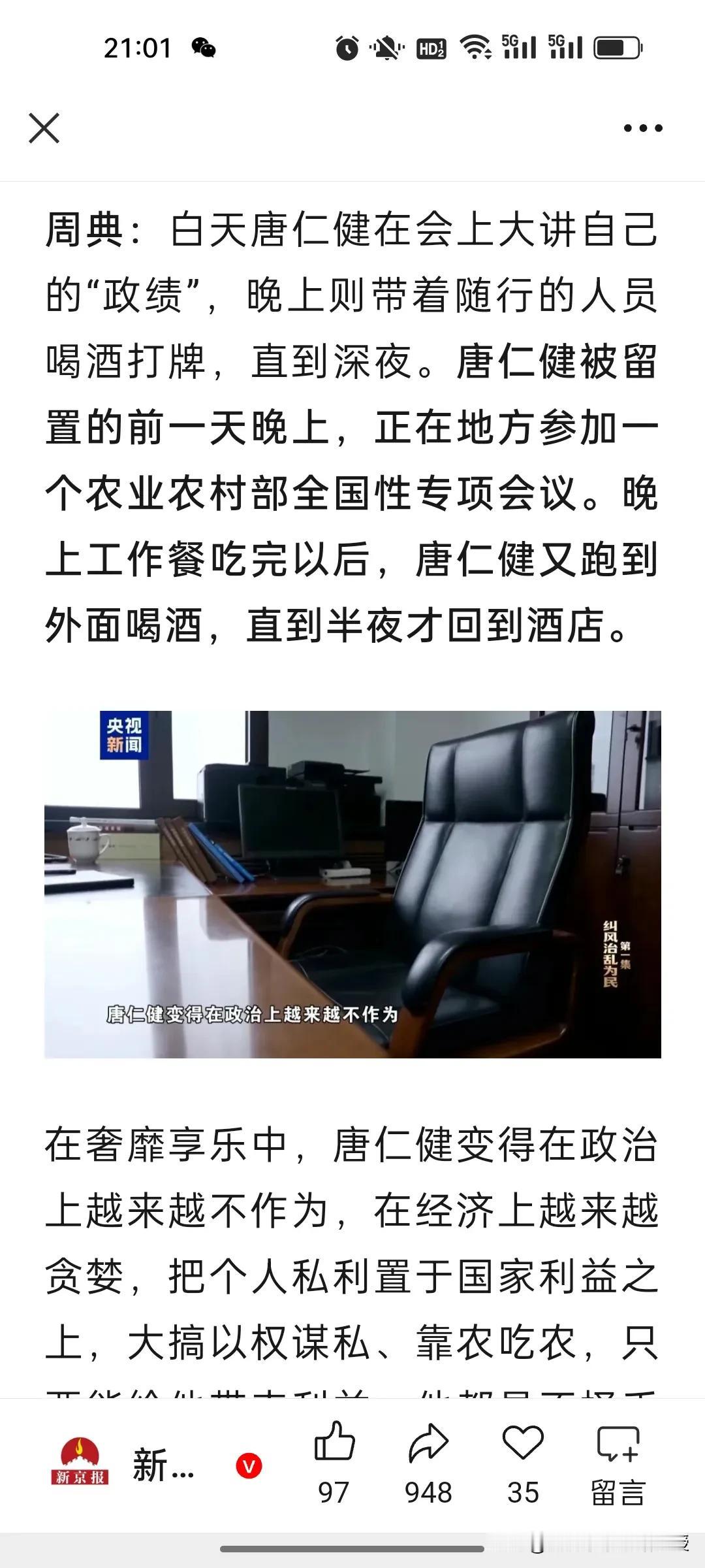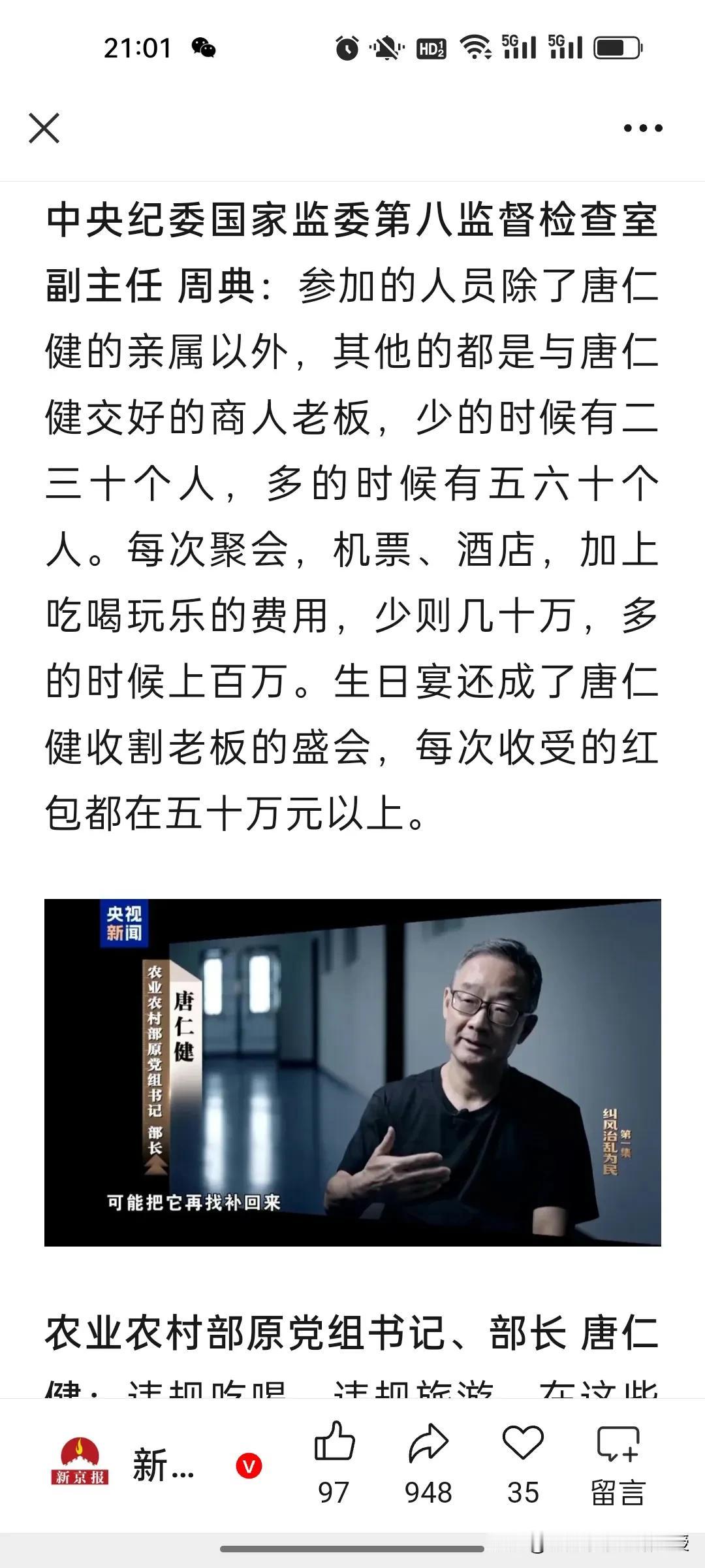 农业农村部原部长唐仁健真的就是隐性腐败的典型!今天在央视播出的反腐大片第一集《纠