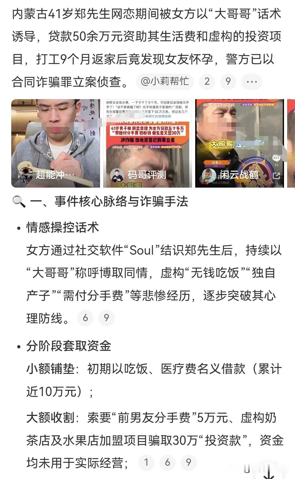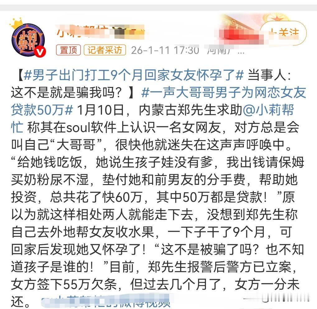 在感情上不要花太多钱,花太多钱也是靠不住的,有多大的能力办多大的事,不要超前消费,不要贷款,用钱留住的爱情,那也不叫爱情,钱没了感情也就没了。 1月11日热搜,男子出门打工9个月回家女友怀孕了。 这个所谓的女友没那么简单,就是骗这名男子的钱的。 没想到这个男人带了50万给这个女人用,真的是太愚蠢了。 一定要严惩这个女子,要让她知道钱不是那么好骗的。