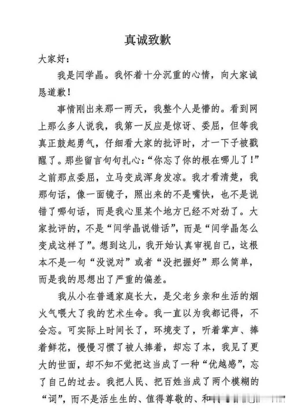 就在刚刚,闫学晶出来道歉了! 仔细看了一下,道歉信写得还算真诚,同时还对自己的错误进行了深刻的刨析,指出自己的本质问题是“忘了自己的根在哪里”。 就像闫学晶自己说的,接下去她要做的,是把心擦干净,找回对劳动、对生活、对百姓的尊重。 真的是“吃一堑长一智”,希望这次的事情能让闫学晶长点记性,不要因为自己取得一些成就就飘了,而忘记了自己的来时路。 (图片来源网络)