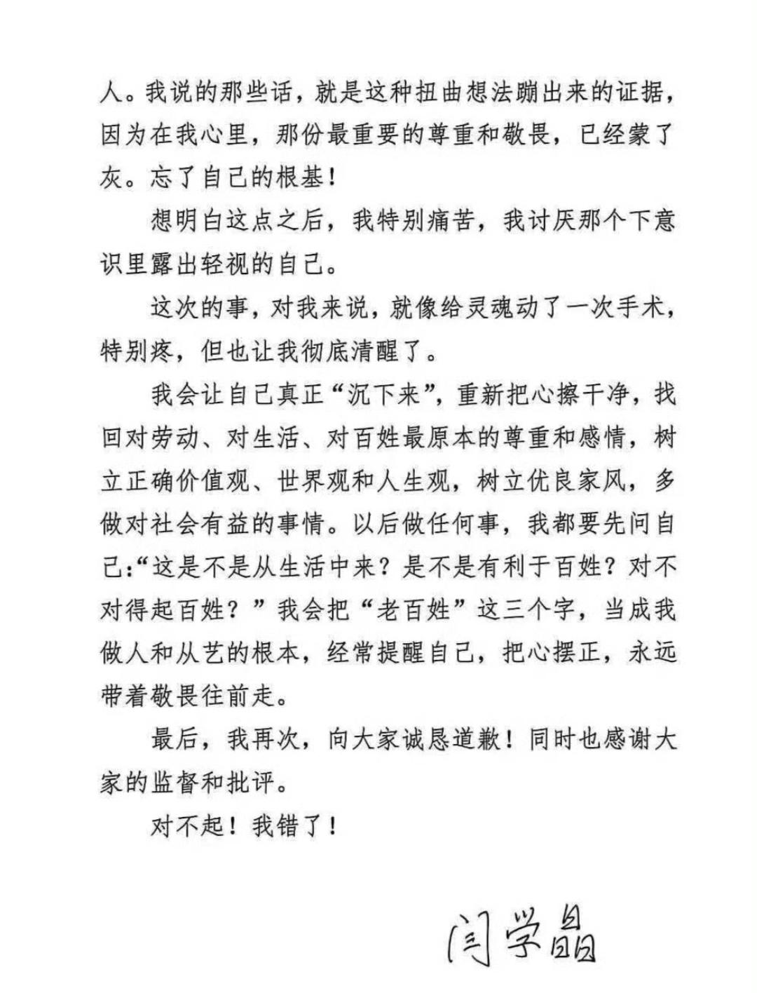 闫学晶被各大平台封禁之后,在自己朋友圈发了个道歉信。 里边内容挺诚恳的,大概意思就是说自己看了大家的留言,一开始自己还是惊讶委屈,等到真正看完大家评论之后,才一下清醒了,觉得确实是自己有点飘了,没把握好。 后续自己也会沉下心来,找回对劳动、对生活、对老百姓的尊重和感情,树立正确价值观,把老百姓三个字当成自己的做人根本 不得不说闫学晶这个道歉信写得挺有意思。 但是我看了一下评论区的网友好像并不买账,而且对于她儿子是不是违规进入新疆班的事情也没有做出回应。 到底是闫学晶真的知道错了,还是耽误她赚钱了,大家自己心里明白就行。