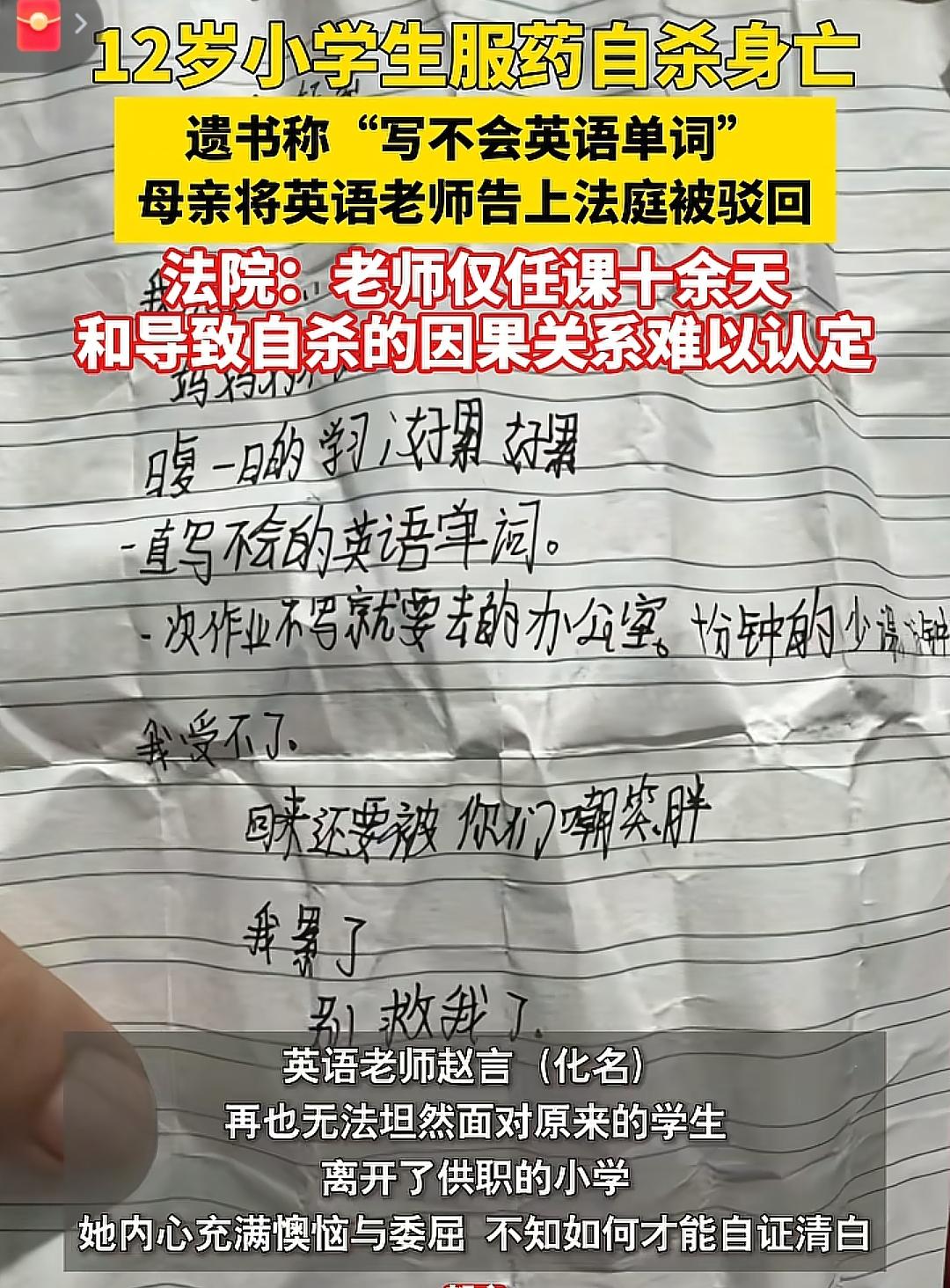 谁该为孩子的离世真正买单?12岁女孩的遗书字字锥心,一句“回来还要被你们嘲笑胖”道尽绝望,可家长却将矛头对准只教了十几天的英语老师[流泪][流泪]。 老师要面对近百名学生,怎么可能顾得上每个孩子的情绪死角?而身为母亲,日日相伴却对孩子的痛苦视而不见,甚至用嘲讽将孩子推向深渊,这难道不是更该反思的地方[伤心][伤心]? 遗书里那句“回来还要被你们嘲笑胖”,道尽了孩子被至亲贬低的窒息,可家长却偏偏揪住英语作业,将矛头对准只教十几天的老师。 老师要面对近百名学生,怎么可能时刻洞察每个孩子的情绪深渊?而身为母亲,日日相伴却对孩子的痛苦视而不见,甚至用嘲讽雪上加霜,如今还揣着明白装糊涂,试图赖上学校换取赔偿,这份私心实在令人心寒。 如今一出事就赖学校、怪老师,以后还有老师敢负责任管教学生吗?老师到底要怎么做,才能既履行教育职责,又能躲开无妄之灾?教育局能不能出台明确规定,划清家校的责任边界?难道最亲近的家人的贬低伤害,就该被轻飘飘忽视吗? 以后还有老师敢负责任管教学生吗?难道至亲的伤害,就要让学校来背锅?别让孩子的离去,变成一场谋利的闹剧。12岁女孩遗书 父母的托举对孩子很重要吗 教育