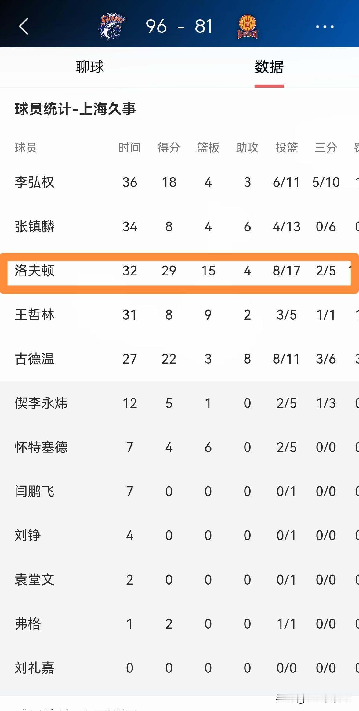 上海久事超级外援洛夫顿真是彻底的杀疯了!在今天上海久事主场以96:81大胜山西汾酒的比赛中,洛夫顿展现出了超级外援的风采,他在攻防两端都打出了统治力。 整场比赛下来,洛夫顿首发出战32分钟,投篮17中8,其中三分球5中2、罚球13中11爆砍29分15篮板4助攻2抢断,他的场上正负值为+19。