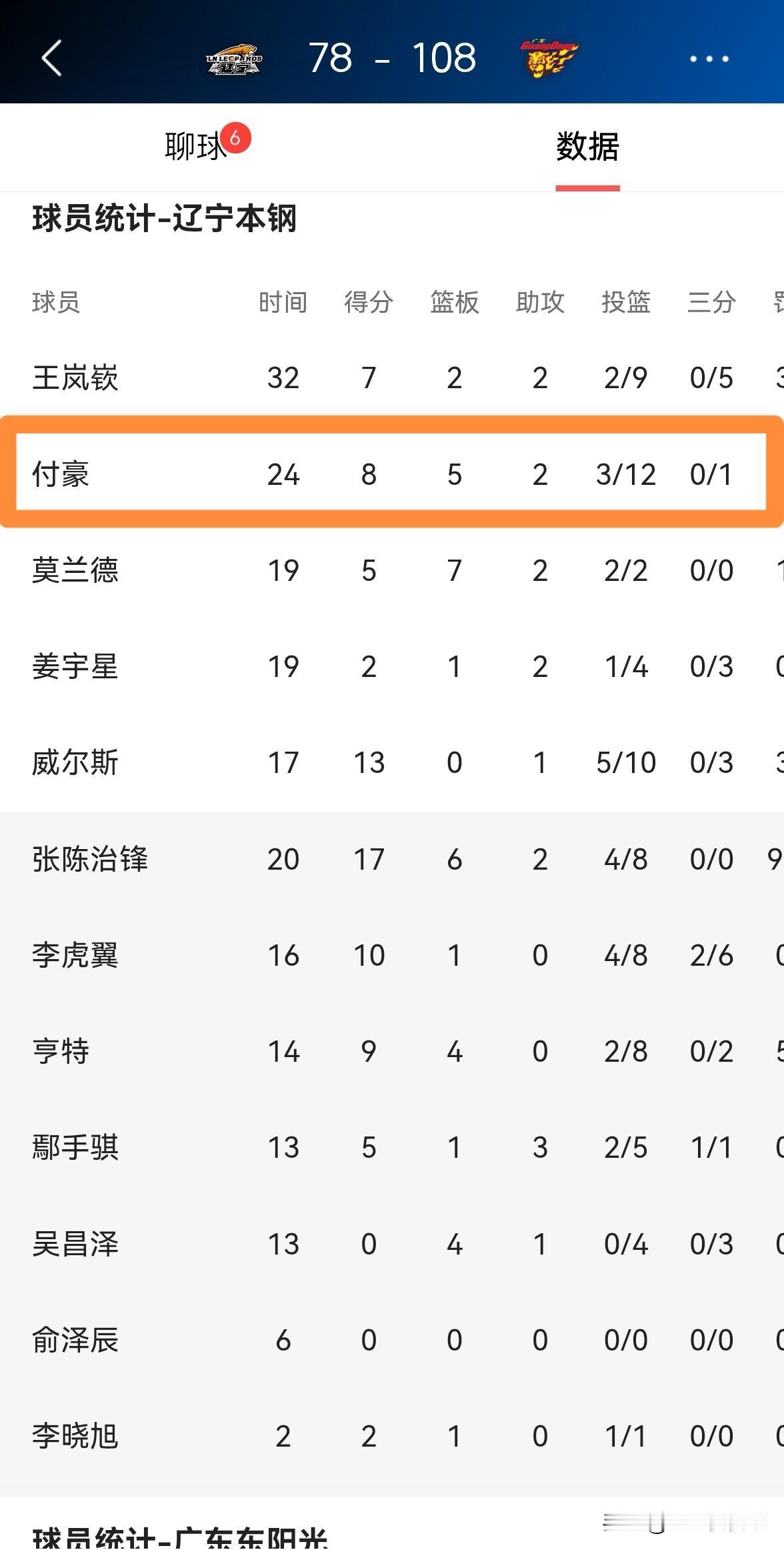 辽宁本钢球星付豪必须要背锅了!在今天辽宁本钢主场以78:108惨败于广东东阳光的比赛中,付豪的表现真是一塌糊涂,他在首发出战的24分钟里,投篮12中3,其中三分球1中0、罚球2中2非常低效的得到8分,他的场上正负值为-20。 作为辽宁本钢的内线支柱,本场比赛付豪的表现完全对不起他的顶薪合同,付豪必须为球队的惨败背锅。