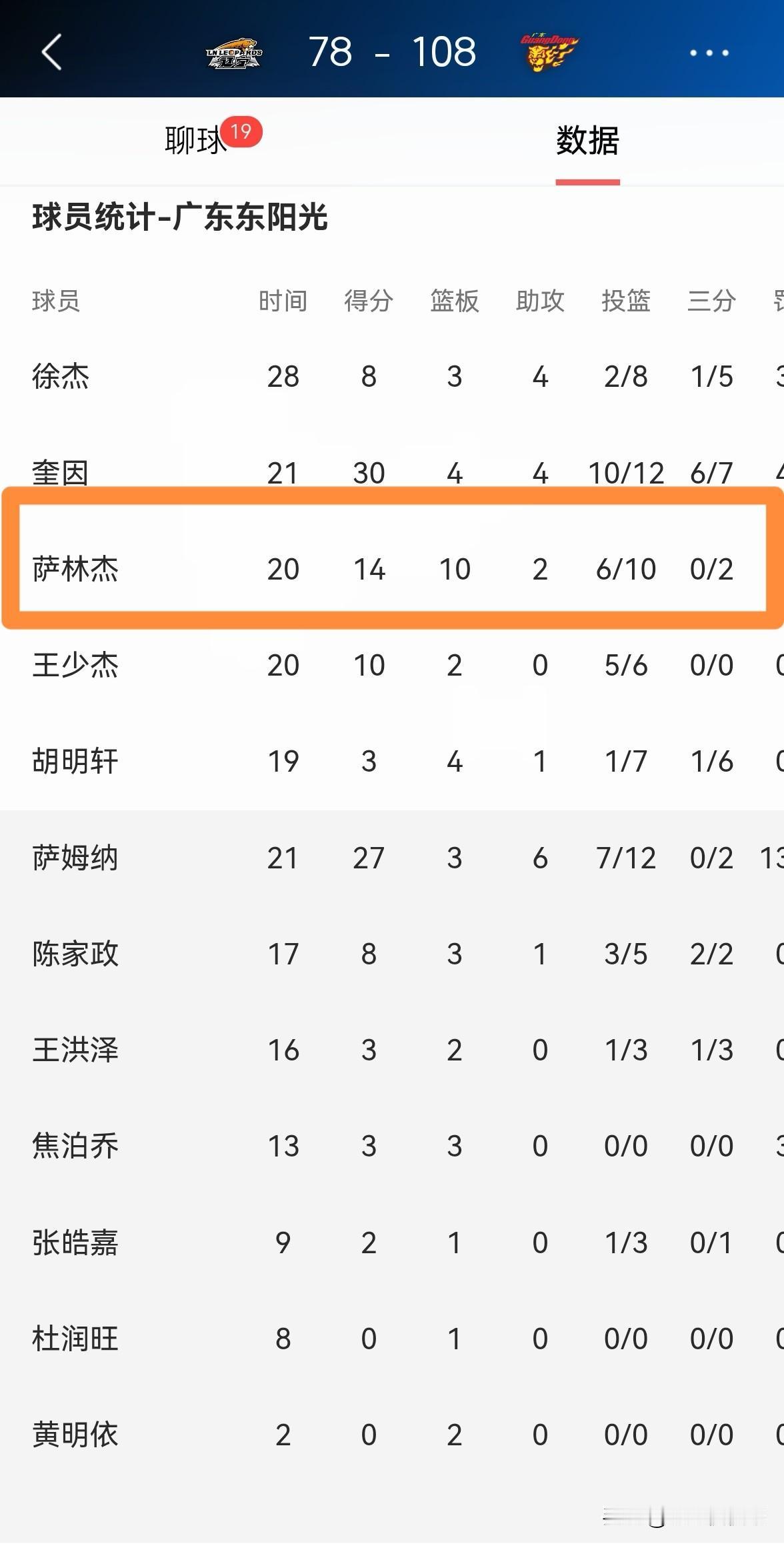 广东东阳光外援萨林杰又躺赢了!在今天广东东阳光客场以108:78大胜辽宁本钢的比赛中,萨林杰首发出战20分钟,投篮10中6,其中三分球2中0、罚球3中2轻松砍下14分10篮板2助攻2抢断,他的场上正负值为+19。 毫不夸张的说,由于辽宁本钢的内线实力过于羸弱,再加上广东东阳光两大外援奎因和萨姆纳发挥神勇,因此我觉得本场比赛萨林杰都没有怎么出汗,萨林杰完全是躺赢了一场比赛。