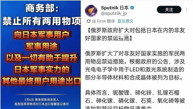 俄罗斯加入军民两用物资禁运日本行列!难怪他们现在抗议声此起彼伏。这次是真的打了它的七寸。如果禁运时间持续太久,他们国内的存货捉襟见肘以后,很多企业就必须被迫停产,更多的人就会失业,社会不安定情绪就会激增,高市下台的呼声就会高涨。弹丸之地,本来是不想和他们计较的,就像当初放弃和他们要巨额赔偿一样。 最近这几天,日本那边闹得挺大,中国1月6日商务部公告一出,直接禁止所有两用物项对日本军事用户和军事用途出口,还包括一切有助于提升他们军事实力的东西,这力度前所未有。稀土这种关键材料自然在列,日本军工体系本来就高度依赖外部供应链,这一下等于直接卡住了脖子。公告说得清楚,这是根据出口管制法等法规,为维护国家安全和利益做的决定,原因就是日本领导人高市早苗公然发表涉台湾地区错误言论,暗示可能武力介入台海事务,严重干涉中国内政。 高市早苗在国会答辩时把“台湾地区有事”跟日本“存亡危机事态”挂钩,这话一出口就触了红线。日本战后承诺不走军事扩张道路,现在却反复在台湾地区问题上挑衅,违背一个中国原则。中方多次警告,但日方不收敛,这次直接用实际行动回应,管制措施针对军事用途,民事出口还是正常渠道,只是严格审批最终用户。日方立刻跳脚,要求撤回,还说损害双边关系,但这完全是自找的。 还没缓过劲来,1月9日俄罗斯也跟进,扩大对包括日本在内的“不友好国家”两用物项禁运清单,新增了光电子领域的一些半导体材料和合成晶体,像铌酸锂、碲化锌、钆镓石榴石、砷化镓这些,日本精密设备和军工生产离不开这些东西。俄罗斯这步棋走得快,直接断了日本从那边补货的念头。中俄同时出手,日本产业链压力成倍增加。 日本企业现在慌得不行,稀土库存据说只能撑几个月,汽车、电子、航空这些支柱产业全受影响。日媒报道,一些国企已经通知日企停止新签稀土合同,民用领域也开始收紧。过去日本总想分散供应链,喊了多年摆脱对中国依赖,但实际进展有限,重稀土加工技术壁垒高,成本大,替代来源根本跟不上。日本学者自己都承认,这次管制如果持续,产业很可能停滞。 说到底,日本这个岛国资源匮乏,战略纵深小,本来就经不起供应链打击。当年中方放弃巨额战争赔偿,本意是以德报怨,促进和平发展,可日方一些政客总不领情,反复在历史和领土问题上搞小动作,以为抱紧美国大腿就能为所欲为。现在中俄同时限制两用物项出口,日本才真正感受到压力。稀土这种东西,中国供应全球八成以上,日本军工想绕道美国也难,美国自己产量有限,还得优先本国。 这事还没完,日本如果继续在台湾地区问题上胡来,后续措施可能更多。国际上谁触碰核心利益,都得付出代价。日本右翼势力膨胀,鼓吹扩军备战,甚至有人提拥核论,周边国家都不乐意。高市早苗不收回错误言论,继续强硬,国内经济恶化只会加速她下台压力。老百姓最在意饭碗和生活,抗议声已经此起彼伏,工厂停产、失业增加、社会不安,这些后果迟早会反映到政治层面。 中方措施完全合法合规,符合国际防扩散义务,其他国家也没法指责。日本现在该反思的是,为什么走到这一步。和平发展是正道,挑衅只会自食苦果。希望日方早点纠正错误,别让事态进一步升级。毕竟两国经贸联系深,正常合作对大家都好,但前提是尊重彼此核心利益。