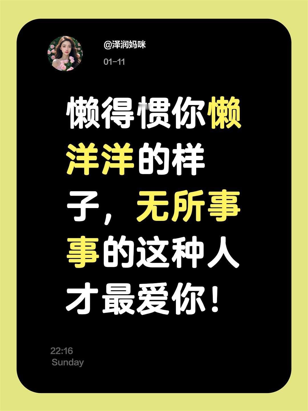 懒得惯你懒洋洋的样子,无所事事的这种人才最爱你! 懒得惯你懒洋洋的样子,无所事事的这种人才最爱你! 🌿原来真爱是这样的:他能接受你在床上躺着刷手机,在沙发上发发呆的样子,哪怕你一整天都懒洋洋地无所事事,他也不会催你、阴阳你,反而会觉得你这样的状态很放松。 生活里真的有两种人:一种见不得你闲下来,总想着让你干活做事;另一种却能欣赏你这种“懒洋洋”的状态,看你舒服开心,他也跟着心花怒放。 前者多半是想控制或索取,后者才是真的把你放在心上,因为他爱的不是你有多勤快,而是你这个人本身。 情感 人际关系
