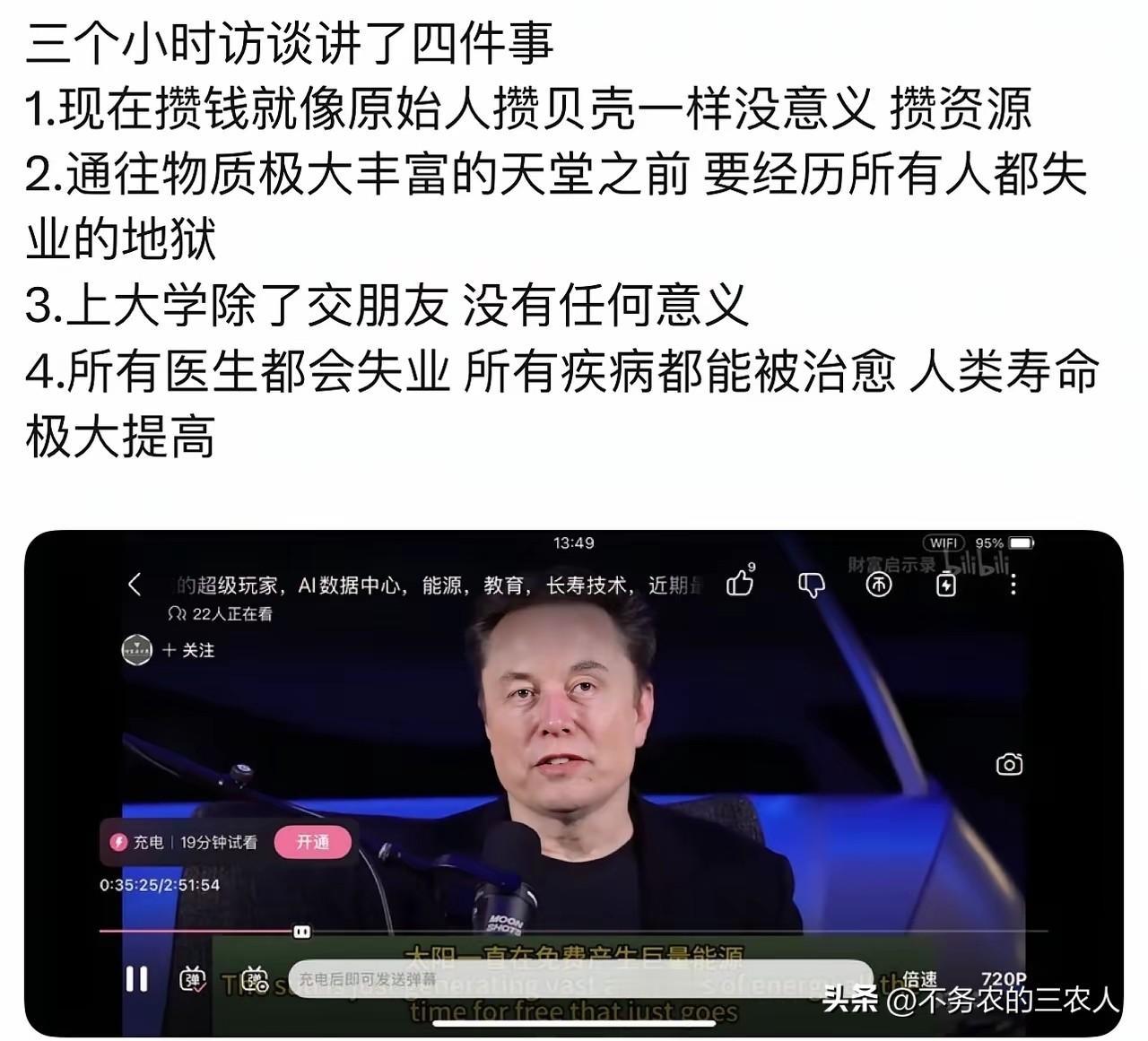 马斯克的“未来预言”来了,我们普通人听听就好,千万别当真! 一场三小时的访谈,这位科技大佬张口就抛出四个颠覆认知的论调:攒钱等于原始人攒贝壳,毫无意义,要攒就攒资源;物质极大丰富的天堂来临前,必先经历全民失业的地狱;上大学唯一的用处就是交朋友,其余皆是空谈;未来所有医生都会失业,疾病被彻底攻克,人类寿命大幅跃升。 乍一听,是不是觉得格局拉满,未来的轮廓都清晰了? 但咱普通人要是真把这话奉为圭臬,那可就离踩坑不远了。 不能说马斯克说得全错。站在他那个层级——手握巨额资本,玩转尖端科技,俯瞰全球产业链——这些预言确实有其超前的逻辑。 他眼里的“攒资源”,是专利、是技术、是核心资产;他口中的“全民失业”,是旧有劳动模式的颠覆,是资本逐利下的产业迭代;他觉得“大学无用”,是因为他的圈层里,人脉和机遇远比重本学历来得实在;他畅想的“无医时代”,是建立在顶尖医疗资源无限倾斜的基础上。 这些话,是顶层精英的生存指南,是富豪阶层的未来攻略,却不是给普通人的生活手册。 对我们而言,攒钱是应对突发疾病的底气,是孩子上学的学费,是老人养老的保障,哪能说扔就扔?全民失业的地狱要是真来了,大佬们有资本兜底,我们普通人靠什么活下去?上大学或许不是唯一的出路,但它是大多数人突破阶层、掌握安身立命技能的跳板,绝非“只交朋友”那么简单。至于“医生失业、百病全消”,更是遥远到近乎科幻的想象,当下的我们,头疼脑热还得往医院跑,看病难看病贵的问题还没解决呢。 大佬的眼光确实毒,但大佬的世界,和我们的人间,隔着万水千山。 听听他的预言,当个茶余饭后的谈资就行,真要照着过日子,那可就真完蛋了。