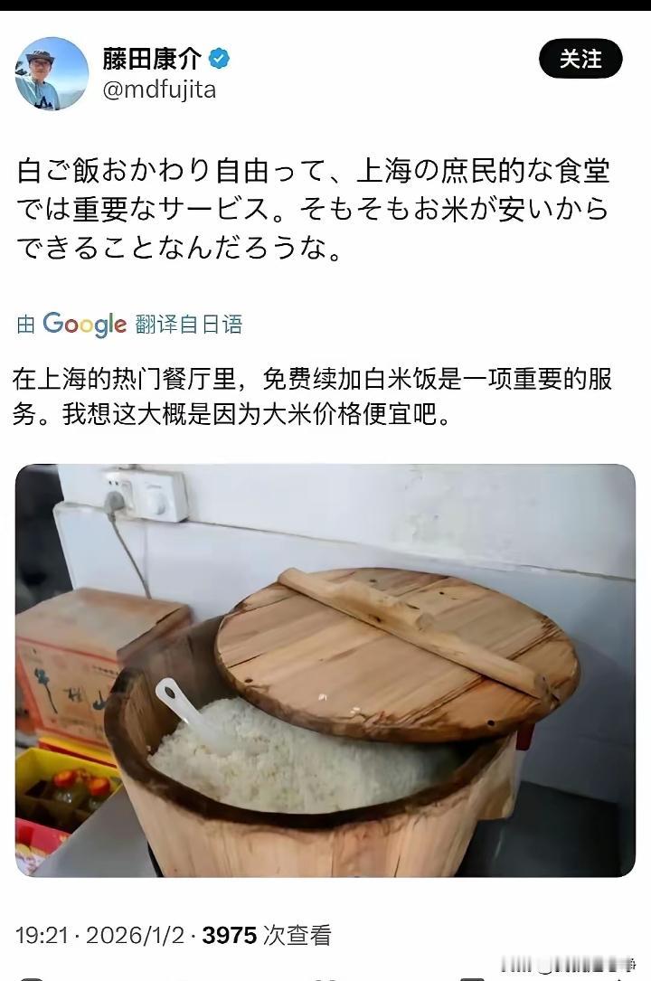 就这点小事儿,就让日本人破防了?还值得大张旗鼓的说两句。 一名日本的游客跑到上海去旅游,他发现饭店里面居然可以免费的续加白米饭。 这让他非常的震惊。 他的贴文上表示,在上海的热门餐厅里面,免费续加白米饭是一项重要的服务。 这个是绝对错误的。 他以为免费续加白米饭是热门餐厅,也就是好的餐厅里面才有的服务。 可是你看看他配的图片。 在上海,米饭免费续加根本不是什么高端服务,而是很多餐馆的平常做法。像费大厨、老乡鸡这些连锁店,都提供按位收费、米饭随便吃的服务,有些快餐店甚至直接免费。 对商家来说,这是一笔划算的账。多加一碗饭成本很低,但能让顾客觉得实惠大方,可能还会多点几个菜。这算是餐饮行业竞争下吸引顾客的一个小招数。 这个日本游客的惊讶,其实挺有意思。现在很多没来过中国的日本年轻人,正把上海当成一个新鲜、想去的旅行地。他们通过旅行博主的视频看到的是一个方便、安全,充满未来感的上海。 所以,免费米饭这件事能引起讨论,不只是因为饭本身。它是一个小窗口,让不同地方的人通过日常消费,互相看到对方社会真实的一面。很多日本游客来上海后,发现这里和想象中不一样,印象大为改观。 这种因为一碗免费米饭引发的讨论,挺有意思的。它说明在大家习以为常的事情上,不同文化背景的人感受可能完全不同。现在很多日本年轻人是通过社交媒体了解中国,他们看到的上海是现代的、有活力的。一碗米饭能引发这么大反应,恰恰说明外国游客对中国的了解可能还停留在表面,实际体验后会有很多新发现。这种日常小事上的文化碰撞,其实比官方宣传更能让人了解一个真实的中国。