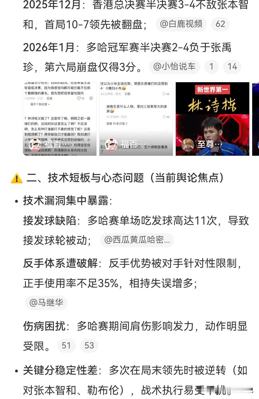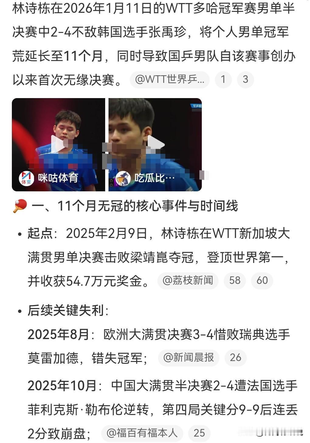 林诗栋已经遭遇到了心魔了吗?千万不要有心魔,不能有心理压力呀。 压力越大,越是发挥不好。 1月11日晚,热搜。 林诗栋已连续11个月男单无冠。 这对他来说真的是非常遗憾的一件事情,因为多次都是得第2名。