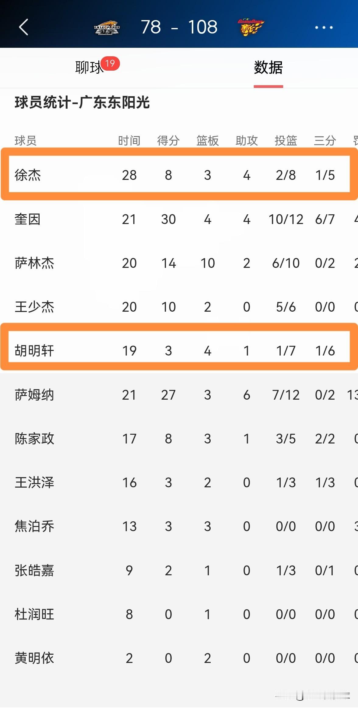 广东东阳光双子星徐杰和胡明轩真是太会来事了!在今天广东东阳光客场以108:78大胜辽宁本钢的比赛中,徐杰和胡明轩深知对手实力较弱,因此他们在比赛中双双发挥失常。 全场比赛下来,徐杰首发出战28分钟,投篮8中2,其中三分球5中1、罚球4中3非常低效的得到8分;胡明轩首发出战19分钟,投篮7中1,其中三分球6中1怒砍3分。 坦白说,辽宁本钢的球迷应该好好谢谢徐杰和胡明轩,不然的话辽宁本钢会输的更惨。