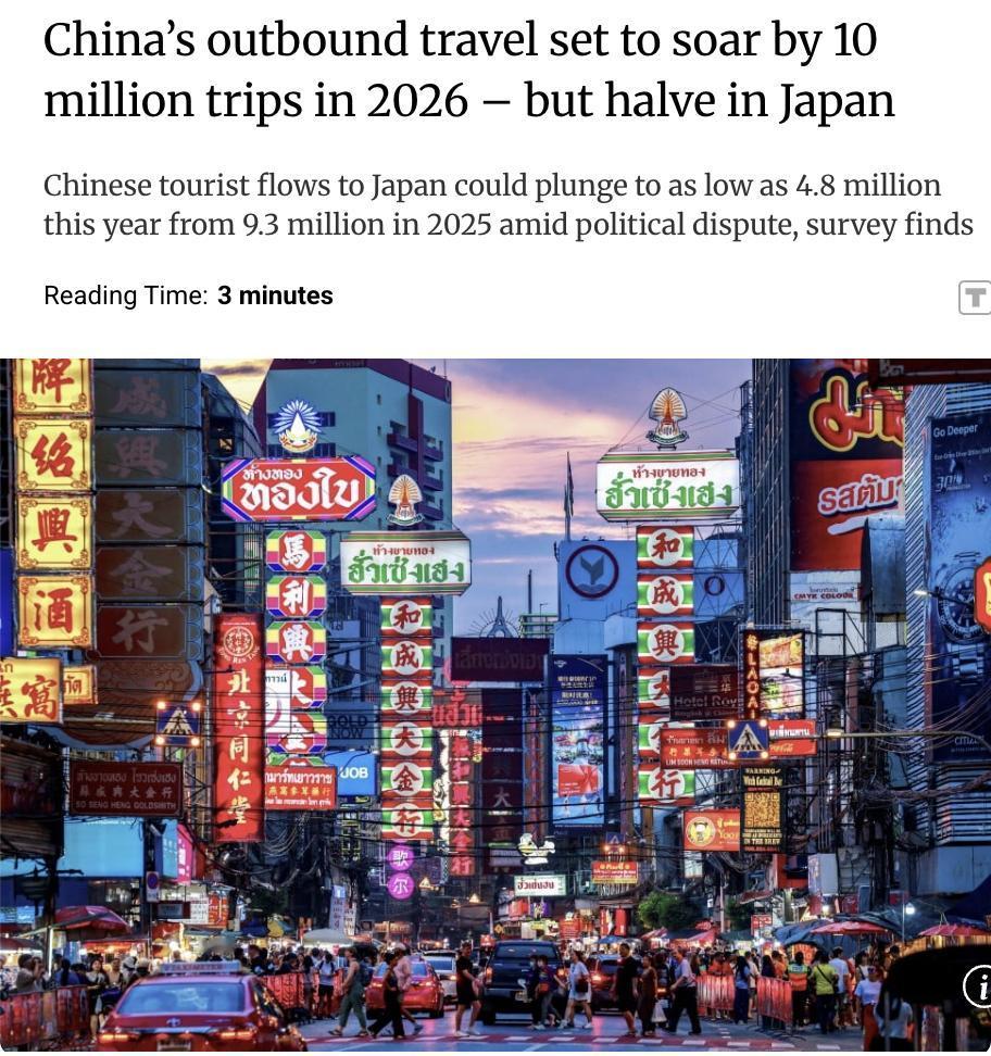 外媒:2026年中国出境游预计增长1000万次,总数达1.65亿至1.75亿次,增长原因包括签证政策放宽和人民币升值。 但受中日政治纠纷影响,赴日中国游客可能减半,从2025年的930万降至480万。韩国、越南和泰国将是今年中国游客的前三热门目的地。 此外,俄罗斯、土耳其等国放宽签证政策后,中国游客数量也将增加。