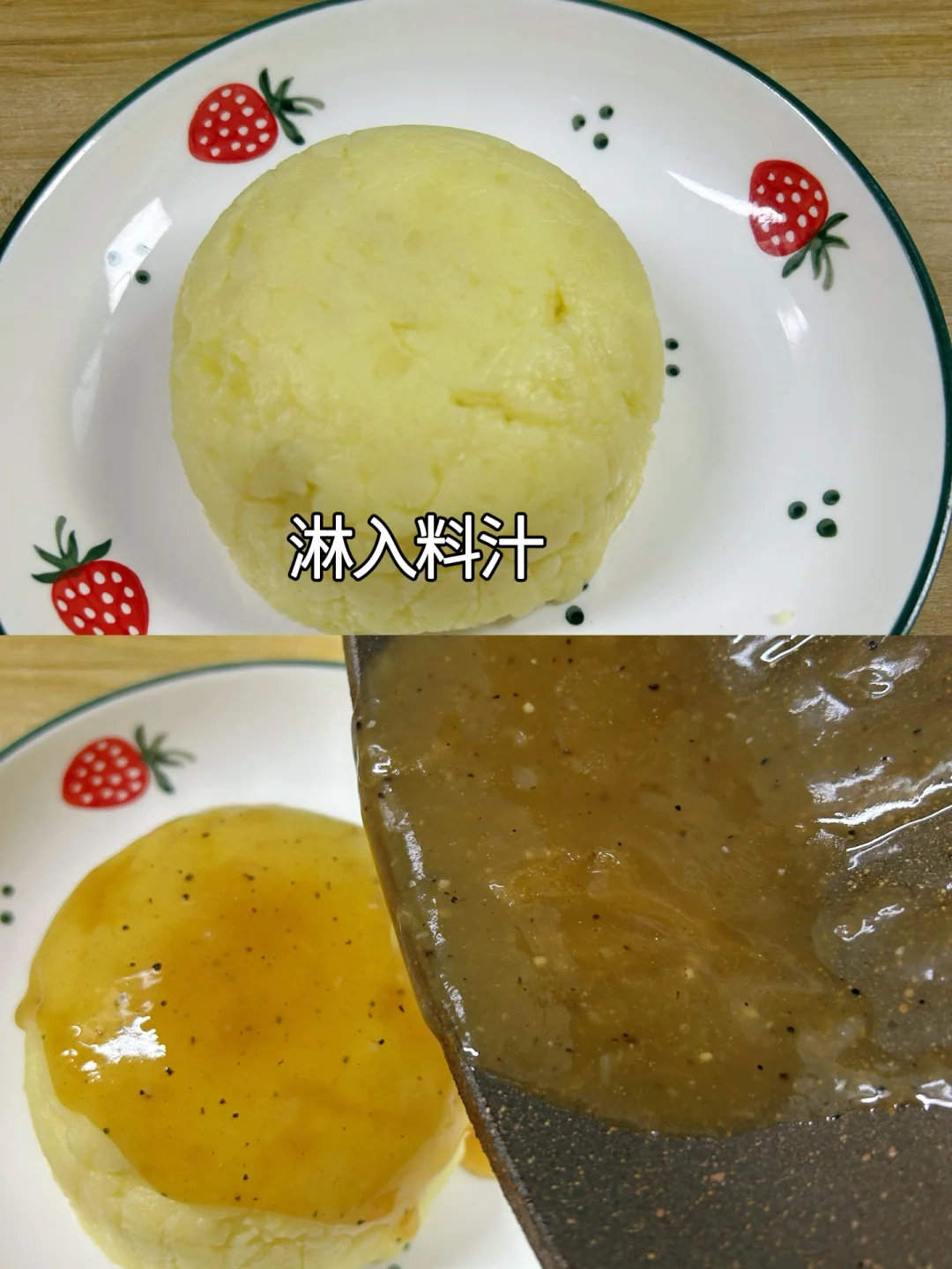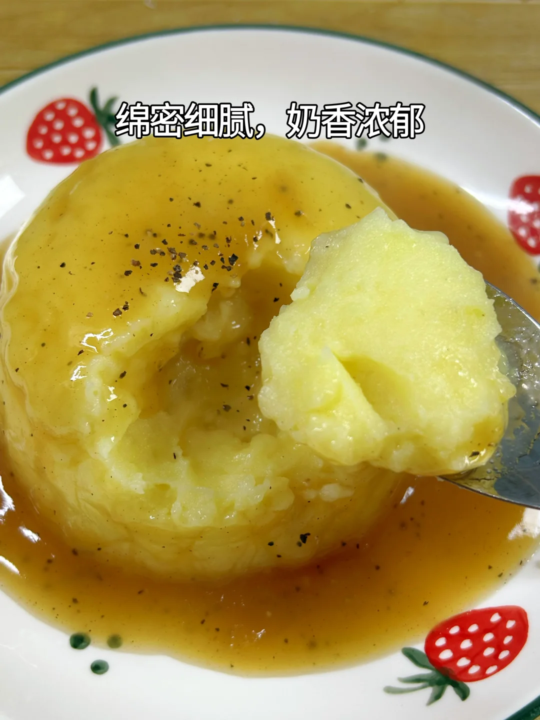 土豆你不要总是炒着吃了,变个花样,做成孩子们喜欢吃的土豆泥,奶香浓郁,绵密鲜香,当主食不错哦。 1.土豆要选黄心粉土豆,切记不能选发芽或表皮变绿的,否则蒸不软烂。我是洗净后晚上用电饭锅预约,早上起来就蒸熟了,蒸了一小时,口感非常粉糯。 2.土豆去皮,加适量食盐、纯牛奶、化开的黄油(可不加),压成泥后拌均匀。 3.调料汁,胡椒粉、蚝油、玉米淀粉,加冷水搅拌均匀。倒入锅里煮沸,成黏稠状态。 4.小碗里铺保鲜膜或保鲜袋,倒入压碎的土豆泥,压实,倒扣在盘子里,拿掉保鲜袋。 5. 最后淋上熬好的料汁,就可以开吃啦!土豆细腻粉糯,自带的清甜混合着奶香,口感完全不输给快餐店。 6.配上水果和牛肉,把土豆当主食吃,营养均衡又美味。