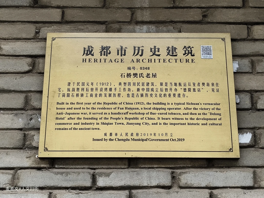 石桥樊氏老屋,位于四川省简阳市石桥镇杨柳街道江西街83号,建筑面积200平方米。建于民国元年(1912年),典型四川民居建筑,为木穿斗结构,小青瓦悬山屋面,房屋结构保留较为完整,院落布局紧凑,且保留着雕刻精致的吊瓜、撑弓等构件。该建筑原是当地航运从业者樊海泉住宅,抗战胜利后曾开设烤烟手工作坊,新中国成立后曾开办“德隆旅店”,见证了简阳石桥镇工商业的发展历程,也是石桥古镇历史文化的重要遗存。此外,附近的石桥古镇南城门,是简阳境内迄今唯一尚存的古城门。