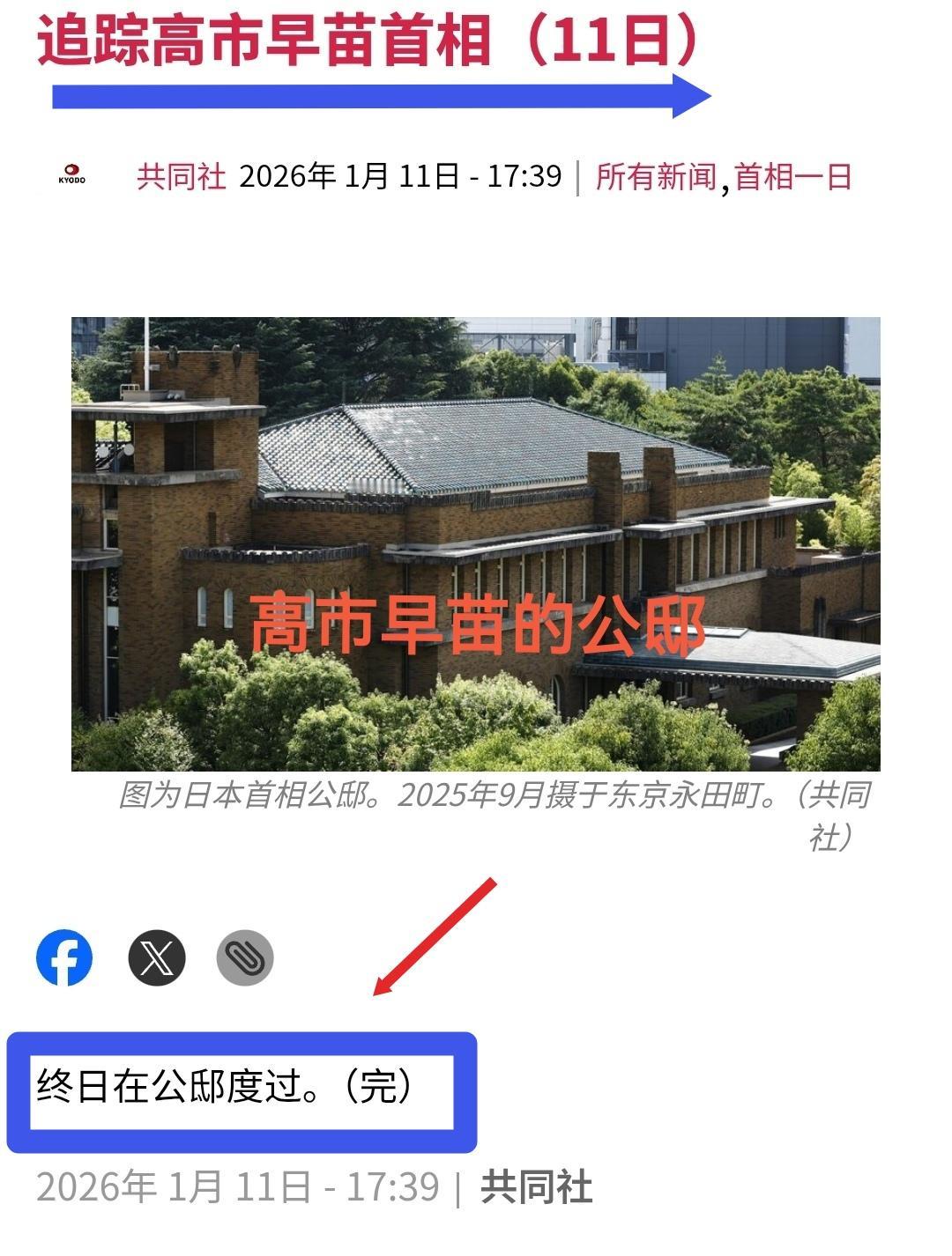 足不出户!高市早苗连续两天没有公务行程,几乎都在公邸度过。就高市的秉性,她不可能在家里主动闭门思过,倒是可能在思考接下来所要面临的两件大事。 第一件大事是在接下来的例行国会开始时,着手解散众院。高市现在是自信心爆棚,非常的自负,自以为现在解散众院再进行选举,她的自民党就会占据优势。第二件大事是将于1月13日在家乡奈良与韩国总统李在明会谈,以及15日与意大利总理梅洛尼座谈。其中李在明是否有意斡旋中日关系,也很值得外界关注。