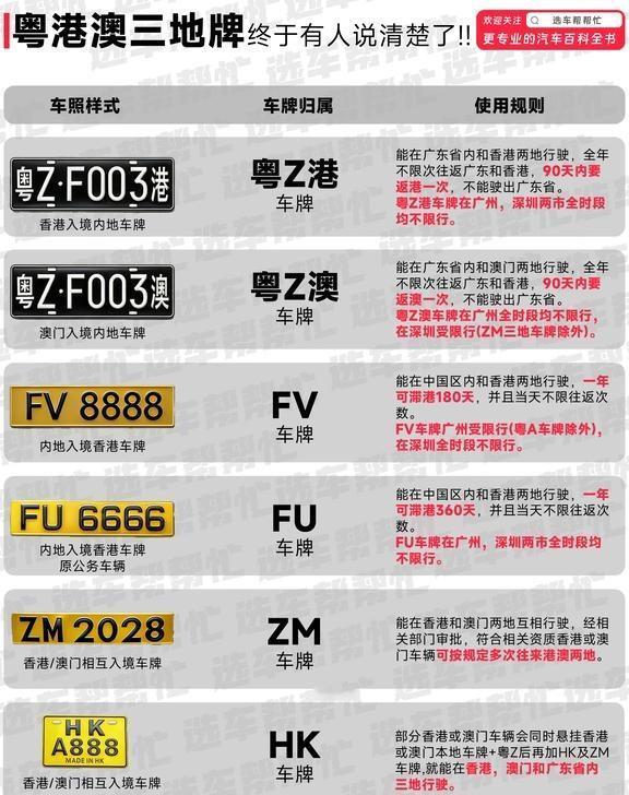 一篇聊透懂粤港澳三地车牌🚗 相信小伙伴尤其是在粤港澳大湾区的来说肯定经常看到这些特殊号牌。这次就把粤港澳三地各类车牌🚗的门道一次讲明白,以后再见到这类车牌,你也能轻松解释清楚: 🚗 粤Z港车牌: 申请主体:在广东省内投资的香港商户及相关机构 申请门槛: 🌟上一年度纳税额达15万以上,即可申请1个通行指标;税额越高,可申请的指标数量越多。 🌟参与公益捐赠或属于高新技术外资企业的,也可申请相关指标 🛣️通行权限:仅限广东省内与香港地区之间往返。 🚗 粤Z澳车牌: 申请主体:在广东省内投资的澳门商户及相关机构 申请门槛: 🌟与粤Z港车牌申请条件相近,核心要求为纳税达标;公益捐赠等特殊情况的申请规则另行规定。 🛣️通行权限:仅限广东省内与澳门地区之间往返。 🚗 FV车牌: 申请主体:仅限广东省内注册的企业 申请门槛: 🌟不同口岸要求不同——深圳口岸需上一年度纳税额超100万元; 🌟港珠澳大桥口岸则要求近三个年度累计纳税超100万元。 🛣️通行权限:覆盖香港地区,更可畅行全国 🚗 FU车牌: 申请主体:符合特定政策扶持条件或参与重点项目的企业 申请门槛: 🌟要求相对特殊,需精准匹配专项扶持政策,或成功参与特定项目,具体细则需以官方文件为准。 🛣️通行权限:根据审批结果确定,通常覆盖粤港澳三地部分指定区域。 🚗 ZM车牌:横琴合作区专属跨境车牌 申请主体:澳门本地企业或常住居民 申请门槛: 🌟需符合横琴新区相关配套政策,对企业经营资质、居民在澳居住时长等均有明确要求。 🛣️通行权限:仅限澳门地区与珠海横琴新区之间。 🚗 HK车牌:香港本地车辆的合法标识 申请主体:香港地区登记在册的车辆 申请门槛: 🌟符合香港运输署相关规定,完成车辆注册登记、缴纳相关税费等常规手续即可。 🛣️通行权限:仅限香港地区范围内行驶。 以上就是粤港澳三地主流特殊车牌的全解析啦,你还有什么问题,也欢迎一起来聊聊 新车上牌 车牌 汽车知识 粤港两地牌 两地牌申请 两地牌 粤Z 汽车分享 玩车无格式