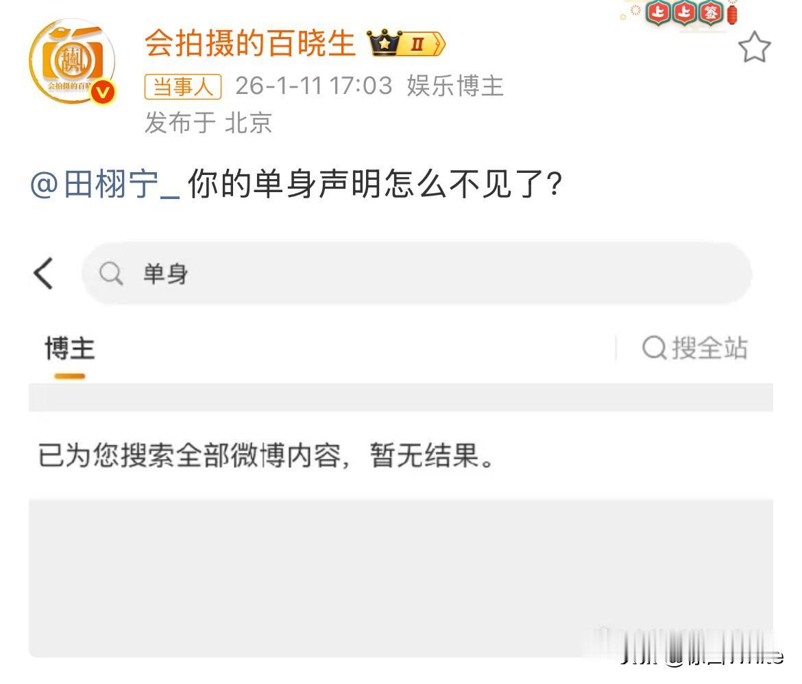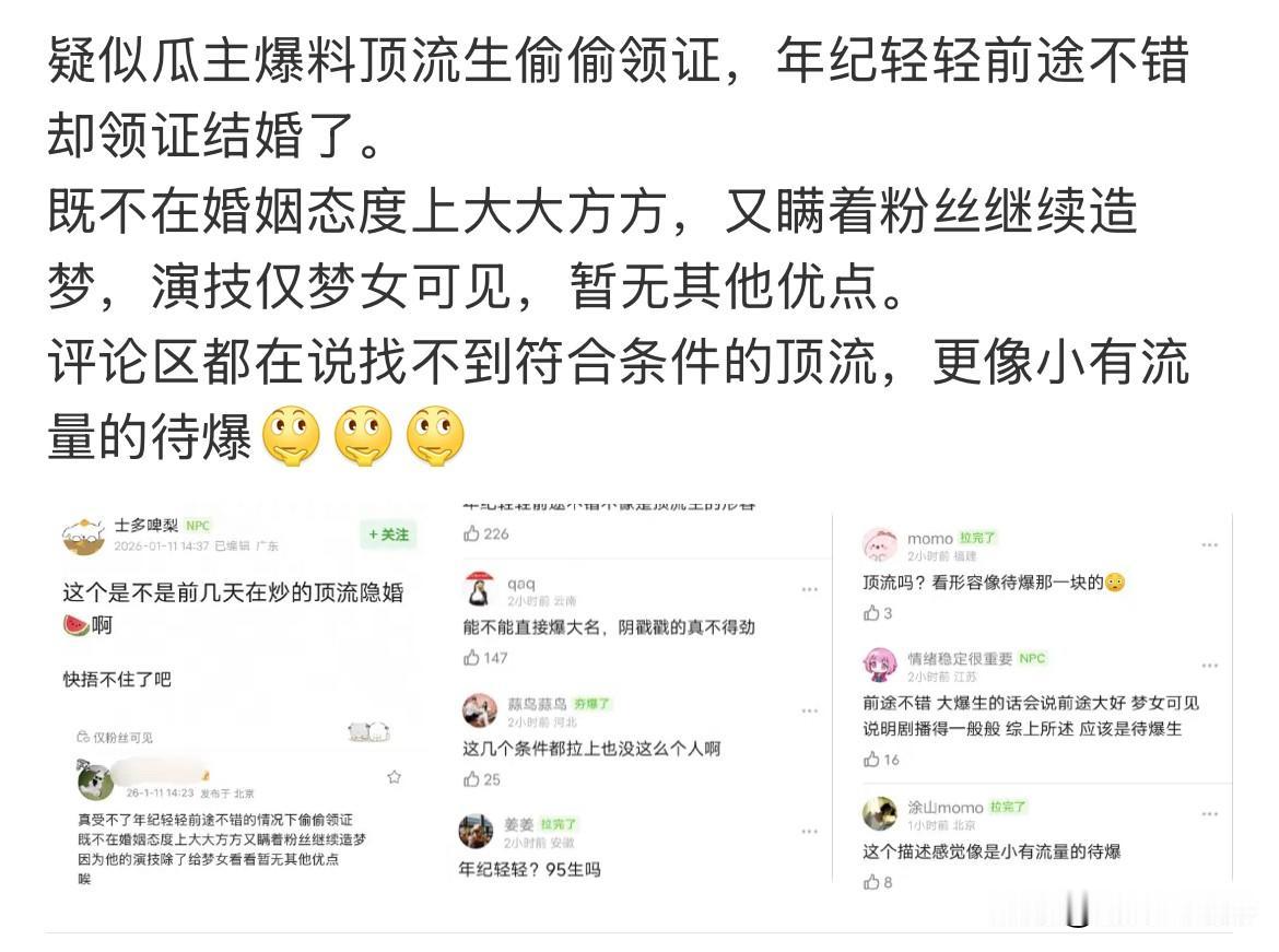 1月11日,娱记质问田雷单身声明不见了 结合孩子的事,所以这两天说顶流生偷偷领证的应该是他吧!我觉得挺好的,他火了以后没有一味吃那部剧的福利,而是踏实进组从男配做起认认真真拍戏,最近看他又去做张凌赫男二了,挺好的,也没有刻意宣传 艺人身份虽然有高收入,但也会给生活带来很多不便,他能够承担责任,给对方及孩子一个家,我觉得是个很不错的人!