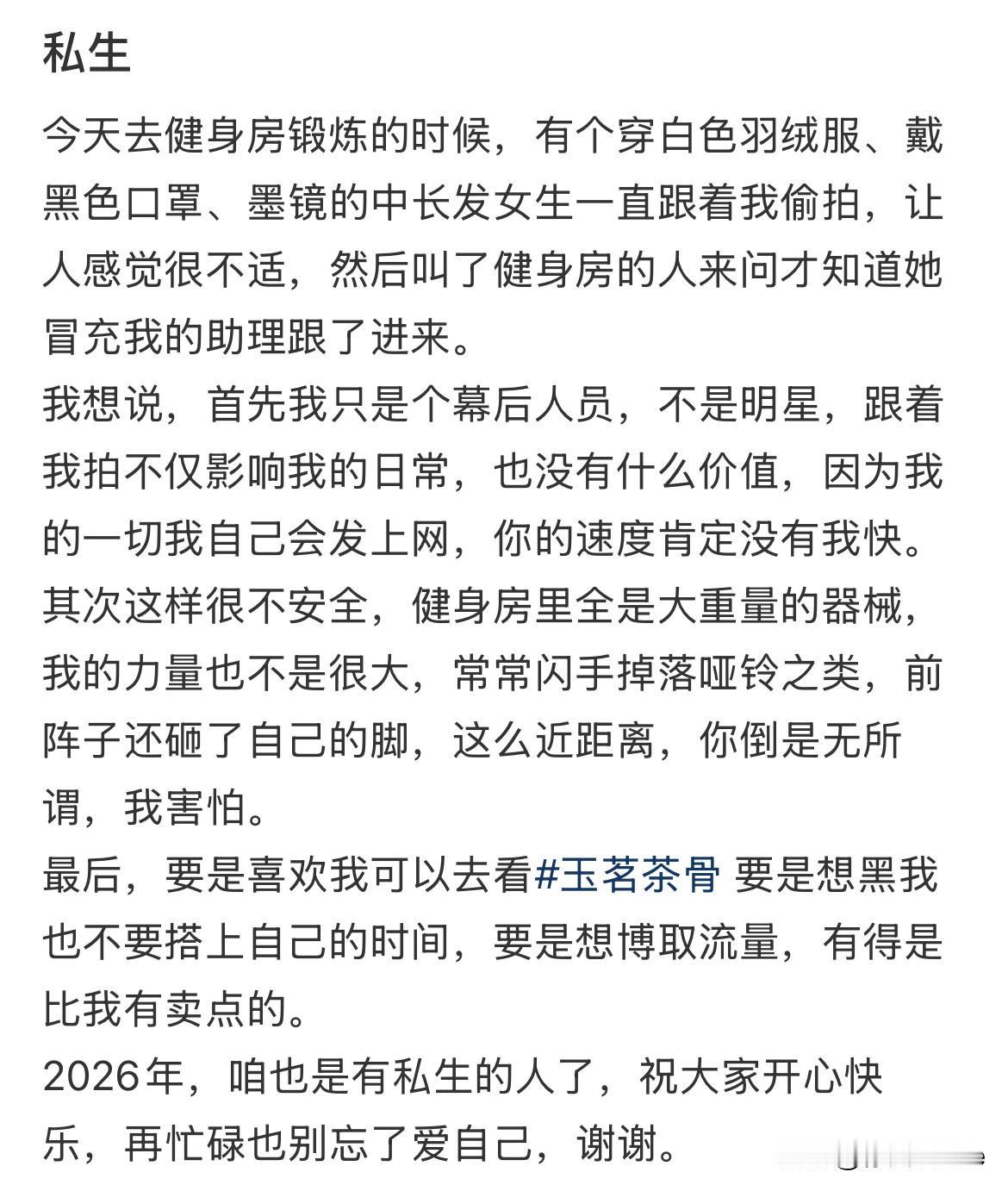 1月11日,于正:咱也是有私生的人了 今日于正发文称,去健身房锻炼时有个女生冒充是他助理跟他进了健身房一直偷拍他 对此于正表示自己只是幕后人员,自己的一切都会发在网上,私生速度可能没自己快,另外健身器材比较重,不小心砸到私生就不好了,看似劝说实则打击跟警告 底下高赞评论,大晚上给我笑醒了,网友说“还私生,人家雇的打手吧”,哈哈哈哈哈,看一次笑一次,网友太有梗了!