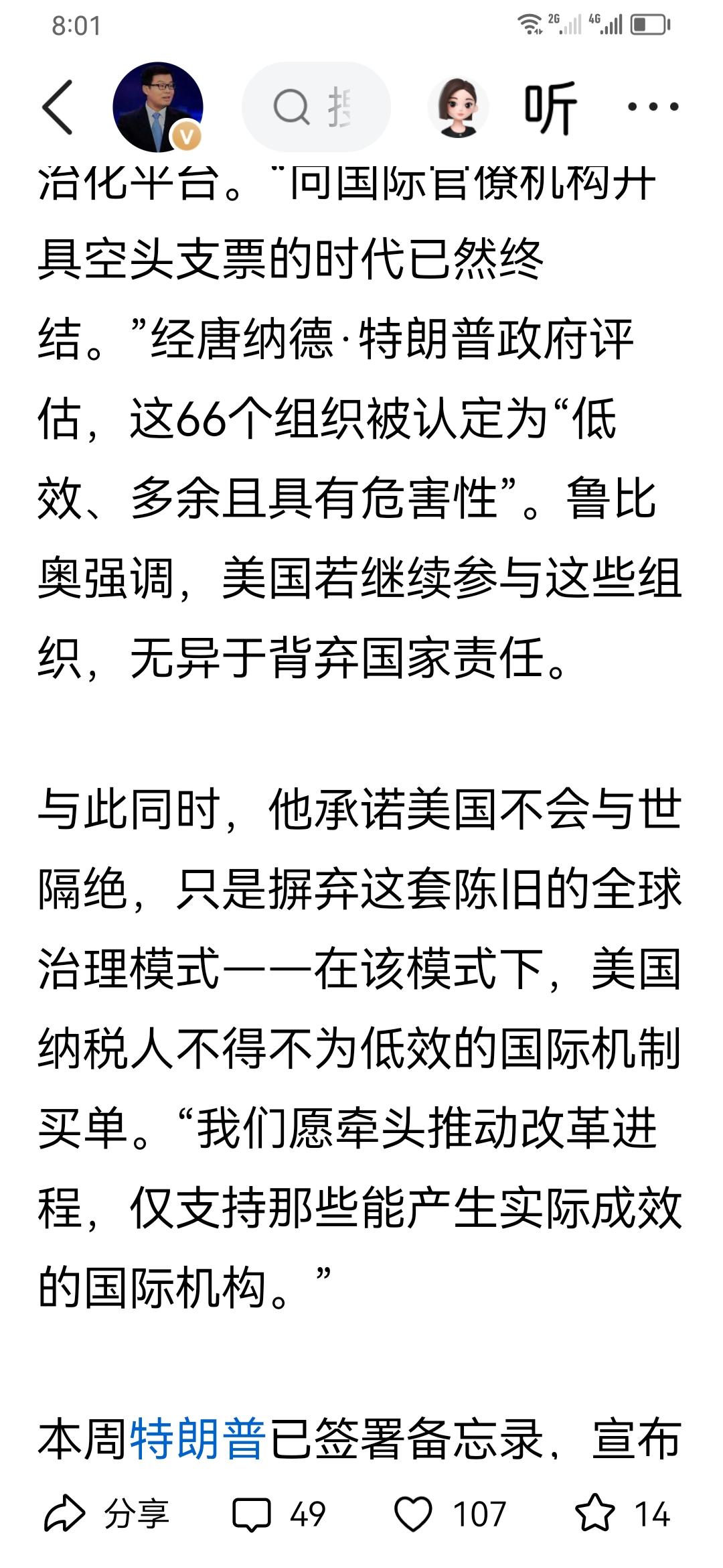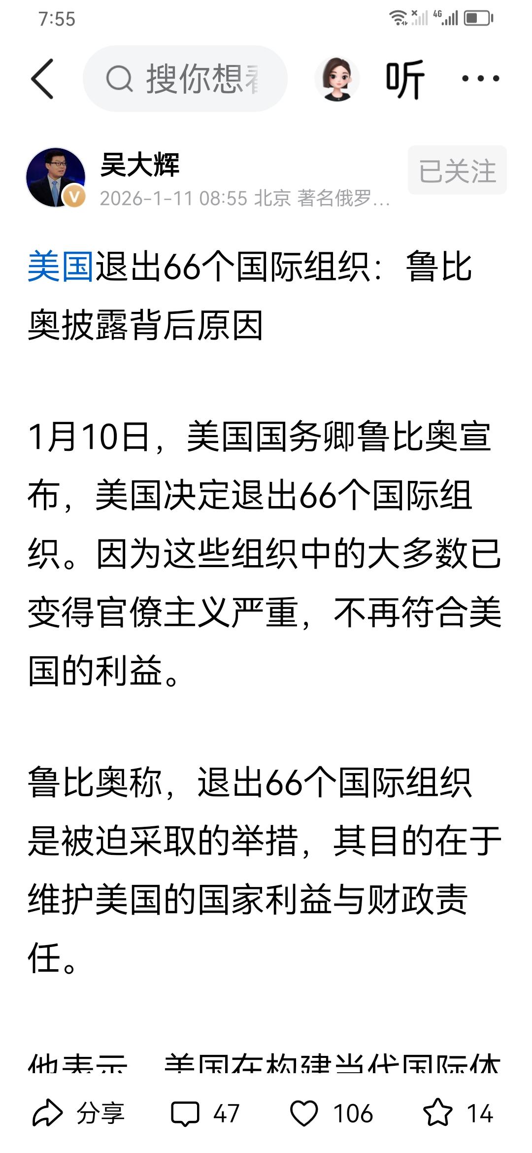 川普不是胡来,他退出66个国际组织,因为这些组织官僚主义严重,人浮于事,浪费美国纳税人的钱。 川普还将在欧洲进一步退出一些组织:威尼斯委员会\生物再生委员会等。 估计就差北约与联合国了。 一个国家走上顶峰,繁荣之后,伴随的是各种扩张,积弊也多了。由盛而衰,走下坡路。 中外历史似乎差不多。 此时,就会出现改革者,革既得利益者的命。 川普是人间清醒的。