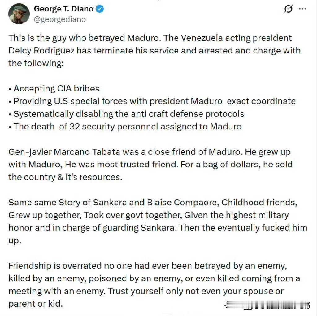 出卖马杜罗的内鬼找到了! 谁能想到,背叛的利刃竟来自最亲近的人?马卡诺不仅是委内瑞拉军事反情报总局(DGCIM)负责人,更是总统荣誉卫队指挥官,是马杜罗从小一起长大的密友。 他们共度青涩年华,见证彼此成长,马杜罗将自己的身家性命、国家的核心安保事务全盘托付于他,这份信任堪比手足。马卡诺的职位有多关键? 他掌控着委内瑞拉最核心的情报网络,负责总统的贴身安保,甚至能左右国家防空体系的运转,堪称马杜罗身边最坚固的“盾牌”。可就是这样一个被寄予厚望的“自己人”,最终却成了最危险的敌人。 委内瑞拉代总统德尔西·罗德里格斯上台后,第一时间便将马卡诺解职逮捕,一连串罪名的曝光,让世人看清了这位将军的丑恶嘴脸。他被指控收受美国中央情报局的巨额贿赂,在金钱面前彻底迷失了心智。 为了装满口袋的美元,他不惜将马杜罗总统的精确坐标拱手交给美国特种部队,让敌方的打击变得精准而致命。更令人发指的是,他蓄意破坏国家防空防御条例。 让委内瑞拉号称南美最强的防空系统形同虚设,美军战机得以如入无人之境般突袭加拉加斯。这场背叛的代价极为惨重,32名忠诚履职、负责保护马杜罗的安保人员,在毫无防备的突袭中殒命,他们的鲜血,成了马卡诺贪腐路上最沉重的祭品。 一个国家的安全防线,最可怕的从来不是外部的强敌,而是内部的蛀虫。马卡诺的背叛堪称“釜底抽薪”,他身处情报与安保体系的核心,知晓所有防御漏洞和行动机密。 美国中央情报局早在2025年8月就开始在委内瑞拉布局,而马卡诺的倒戈,让美方的情报收集变得易如反掌,甚至能对马杜罗的行踪进行长达数月的精准监视。 当美军发动突袭时,电子战压制配合他破坏的防空条例,让委方雷达屏幕失灵、通信链路中断,整个防御体系在短短数小时内彻底崩塌。这哪里是一场军事突袭,分明是内鬼与外敌联手导演的一场精准猎杀。 马卡诺的堕落,是人性的悲剧,更是对国家与信任的极致践踏。他与马杜罗的友情,历经数十年风雨,本应是危难时刻最可靠的支撑,却在美元的诱惑下碎得一文不值。 有人说“利字当头,万般皆可抛”,可马卡诺抛掉的,不仅是朋友的信任,更是国家的主权、人民的安危和军人的荣誉。他身居高位,本应肩负守护国家的重任,却沦为外敌的棋子。 用同胞的鲜血和国家的利益换取个人的荣华富贵,这样的行径,连最基本的良知都已泯灭。委内瑞拉的这场危机,也给全世界敲响了警钟。一个国家的安全,从来都离不开内部的团结与忠诚。 再先进的武器装备,再严密的防御体系,只要内部出现像马卡诺这样的叛徒,一切都将化为乌有。马杜罗政权曾耗费心力构建以DGCIM为核心的情报安保网络,却没能防住身边人的背叛。 这恰恰印证了“堡垒最容易从内部攻破”的真理,32名安保人员的牺牲,不是因为战力不济,而是因为背后被最信任的人捅了刀子;国家防空系统的瘫痪,不是因为技术落后,而是因为关键岗位被叛徒掌控。 马卡诺的落网,是对逝者的告慰,也是对背叛者的严惩。但这场背叛带来的伤痛,却需要委内瑞拉人民用漫长的时间去愈合。国家陷入动荡,民生遭受影响,而那份被辜负的信任,更是难以在短时间内重建。 马卡诺或许能拿到一时的美元,但他永远失去了人格与尊严,将被永远钉在委内瑞拉的历史耻辱柱上,遭世人唾弃。 忠诚是立身之本,更是立国之基。 马卡诺的案例深刻警示我们,无论身处何种位置,无论面对何种诱惑,都不能忘记自己的使命与担当,不能背弃自己的国家与人民。背叛者或许能得逞一时,但终究逃不过法律的制裁和历史的审判。 委内瑞拉的这场背叛与反击,也让我们看清:任何妄图靠出卖国家利益换取个人私利的人,最终都将自食恶果。