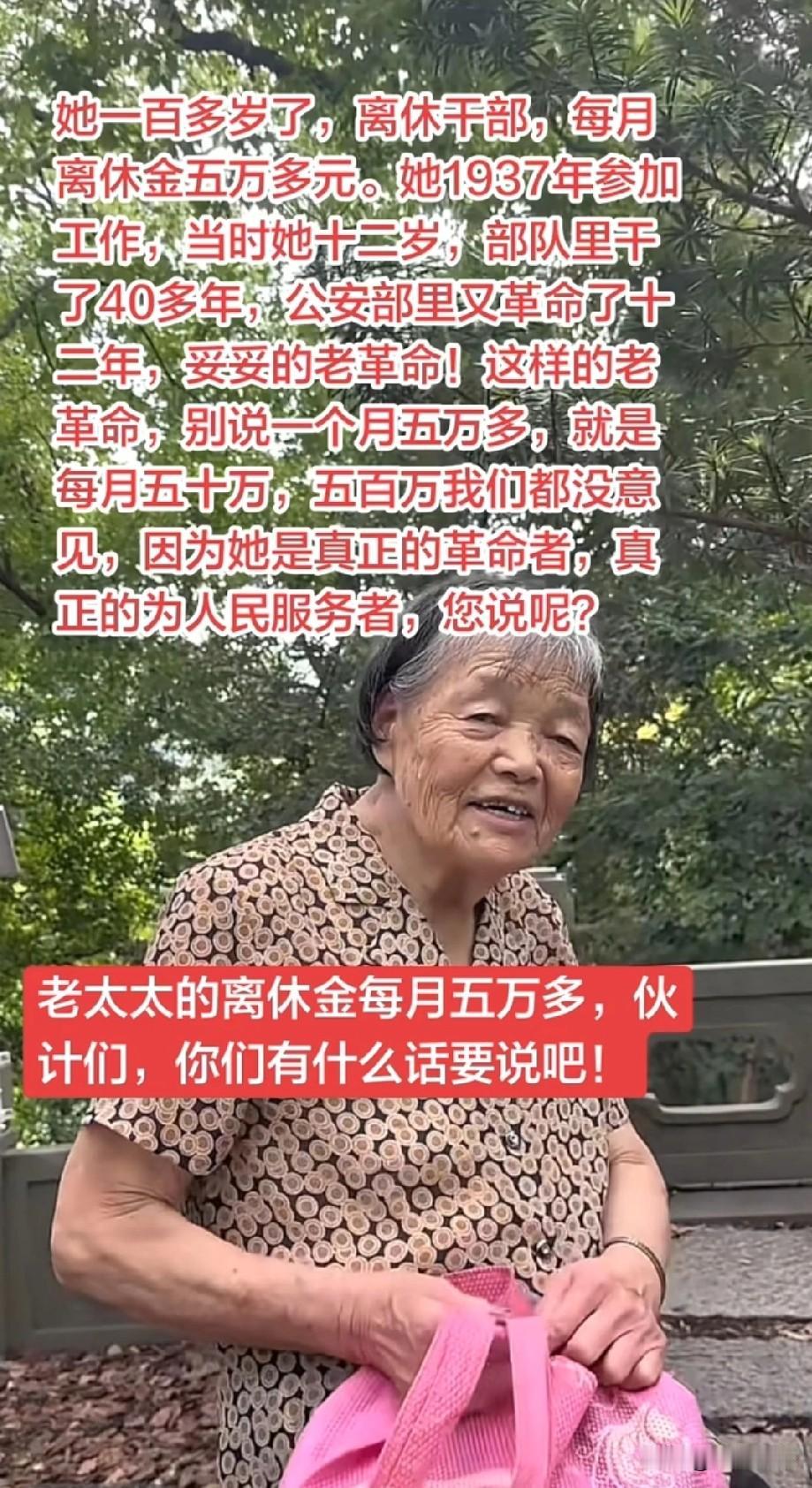 老奶奶一个月享受5万多,我感觉她的收入并不多!画面中的这个老奶奶,今年100岁了,她1937年参加工作,当时才12岁,在部队工作了40年,在公安部工作了12年,65岁离休,是一个老革命。老奶奶现在一个月享受5万多元,乍一听,感觉特别的多,但想一想老奶奶的工作经历,工龄50多年,参加过抗日战争,解放战争,抗美援朝,可以说是九死一生,非常的不容易,如今都100岁了,这样一个革命老前辈,享受这些钱一点也不多,再比这多一些,我也支持!
