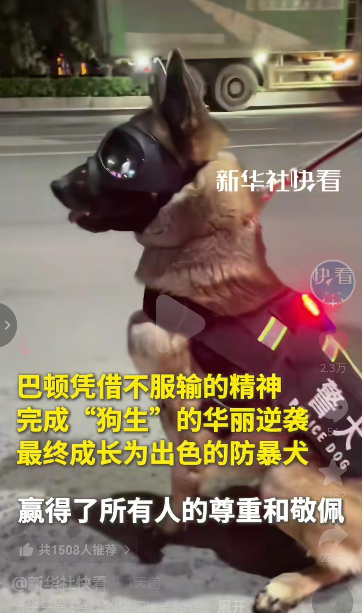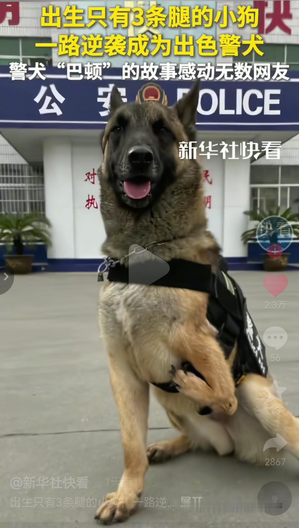 所有的人都不看好你,可是,偏偏你最争气!河南淅川的特警队里,有一只特别的警犬,它叫巴顿,刚出生时命运跟它开了个玩笑,左前肢发育不良,只有三条腿能正常活动。 谁也没想到,它最后凭借自强不息的拼搏精神,完成华丽的逆袭,成长为一名出色的防暴犬,赢得了所有人的尊重和敬佩。 据了解,巴顿一开始并不顺利,它是一窝马犬里的一员,可偏偏左前肢发育不良的先天缺陷,让它一开始就被排除在警犬候选名单外。 于是,工作人员想着给它安顿好,便把它送到了群众家里领养。 可是,巴顿天生精力旺盛,不仅调皮捣蛋,力气还大,甚至总爱跟其他狗狗打架,领养人实在招架不住,最后又把它送回了特警队。 后来,经过训练,它除了左前肢残疾以外,竟然成了这一窝马犬里综合警务品质最高的那个。 因此,巴特从一只大家都不看好的狗,变成了大家都赞赏的狗。 网友看到后评论说:“巴顿好样的!这才是真正的勇士。” 还有的网友说:“被这只小狗整破防了,它都这么努力,我还有什么理由躺平。” 是啊,巴特就像困境中的人一模一样,人生哪有什么天生的完美,重要的是你有没有勇气去面对不完美,有没有决心去改写自己的命运。 巴顿的故事,不只是一只小狗的逆袭,更是给我们所有人的一堂课:天生残疾又如何,不被看好又如何? 只要心里有火花,眼里有光,通过自己的努力,照样能活成最耀眼的样子。毕竟,真正的强大,从来不是拥有一个健康的身体,而是拥有一颗积极向上和永不言败的心。