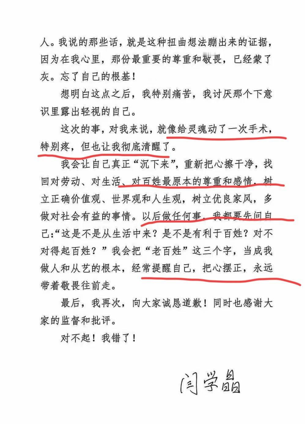 闫学晶这封道歉信,你看懂了吗? 看着也挺诚恳。 她说自己“思想跑偏了”,说“忘了根”,还说要给自己的灵魂“动手术”。 看着这封信,我心里挺不是滋味的。我就想问一句:这到底是她半夜睡不着,突然良心发现想通了?还是因为实在没办法了,为了保住一家老小的饭碗,甚至是为了保住儿子的前途,才不得不低头? 信里有几句话,听着是有点扎心,不像是背台词。 她讲到看到网友骂她“忘了根”,她觉得后背发凉。这种感觉,演不出来。可能真是被骂醒了,意识到自己真的做错了。 她没找借口说“口误”或者“被黑”,而是承认自己被夸得多了,就觉得自己高人一等,把普通老百姓当成了模糊的背景板。能承认这点,说明她可能真的开始反思自己了。 她说要重新找回对生活的热情,对普通人的感情。如果她是真心的,那这次摔跟头,也许真能让她变回那个接地气的演员。 但我们也不能光看道歉信,还得看看信背后那些让她不得不低头的事。 儿子的“学历被扒”: 这是她最疼的地方。她儿子林傲霏被卷进了“中戏新疆班”的事儿,虽然学校澄清了,但网上骂声一片。当妈的这时候不站出来认错,儿子的学历都可能被取消。这封信,是不是为了救儿子? 饭碗保不住了,合作的品牌跑了,账号也被封了。如果再不道歉,以后谁还敢找她干活?这封信,是不是为了给自己留条活路? 她是赵家班出来的,这次闹这么大,不光自己丢人,整个班底都跟着遭殃。这时候低头,也是为了给家里人一个交代。 到底她是咋想的?你自己琢磨 这事儿,公说公有理,婆说婆有理。 如果是真心悔改,那这封信就是个好的开始。以后别光说不练,多演点好戏,多做点实事,大家自然会原谅你。 如果是被迫演戏,那这封信也就是个缓兵之计。但演得再好,时间长了,大家也能看出来。 看着这封写得挺认真的道歉信,你觉得那个写下“我错了”的闫学晶,是真的醒悟了,还是被逼得没招了? 评论区里,说说你的想法。