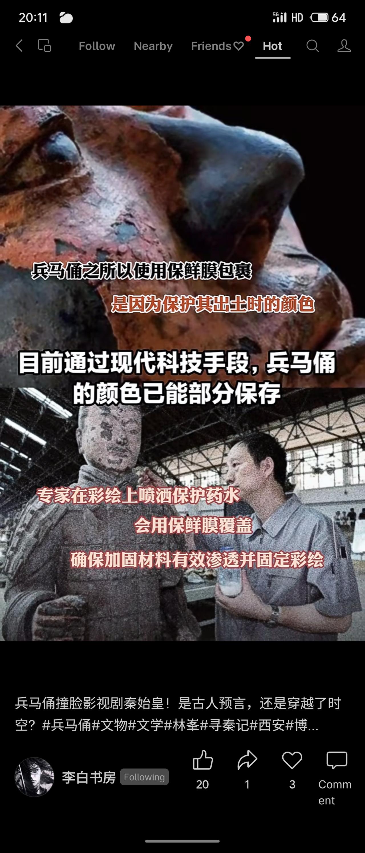 在兵马俑保护修复区,编号T23G1015的俑头因侧脸轮廓与影视剧《寻秦记》中角色神似而引发关注。其面部包裹保鲜膜是为保护出土时的彩绘,现代技术通过喷洒保护药水并用保鲜膜覆盖,以固定和保存颜色。