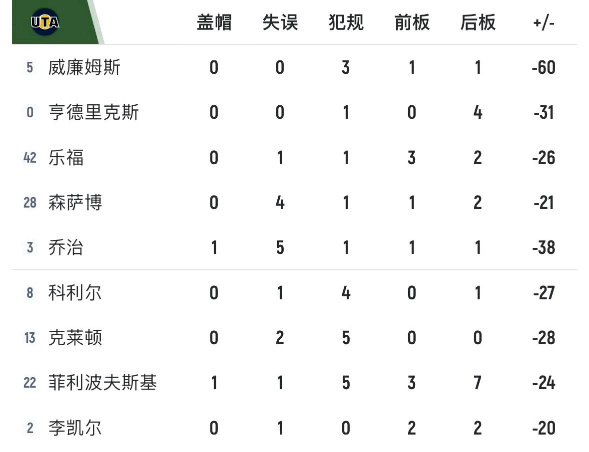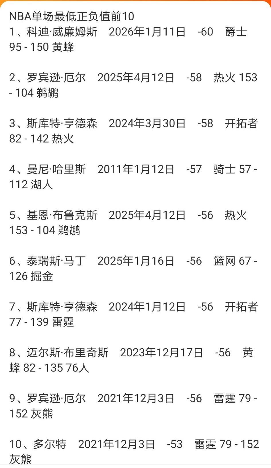 黄蜂客场大胜爵士55分,科迪威廉姆斯的正负值-60是什么概念? NBA球员单场最差正负值记录是-58,由开拓者球员亨德森和前鹈鹕球员罗宾逊-厄尔创造。