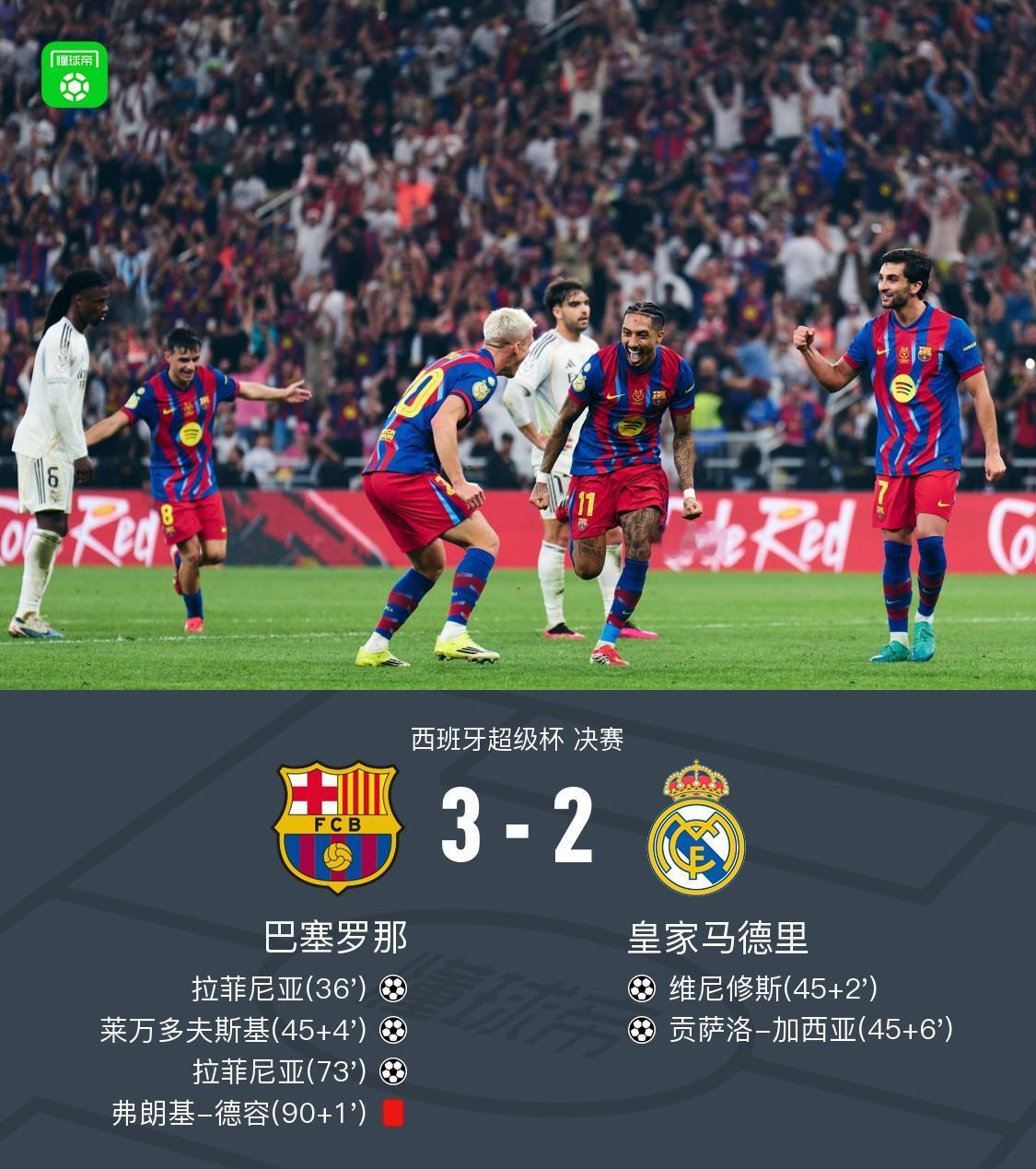 西超杯快讯 :皇马又输巴萨了。 恭喜恭喜:巴萨夺得新年第一冠,西超杯冠军。 恭喜恭喜: 当之无愧!拉菲尼亚当选西超杯决赛MVP,戴着炫酷墨镜领取奖杯。 这场比赛的看点:以为姆巴佩一上场,就会扭转局面,结果皇马还是输了。 阿隆索换人不当,战略决策差,会下课吗? 西超杯巴萨3-2皇马夺冠,拉菲尼亚双响,维尼修斯一条龙破门。 巴萨 皇马