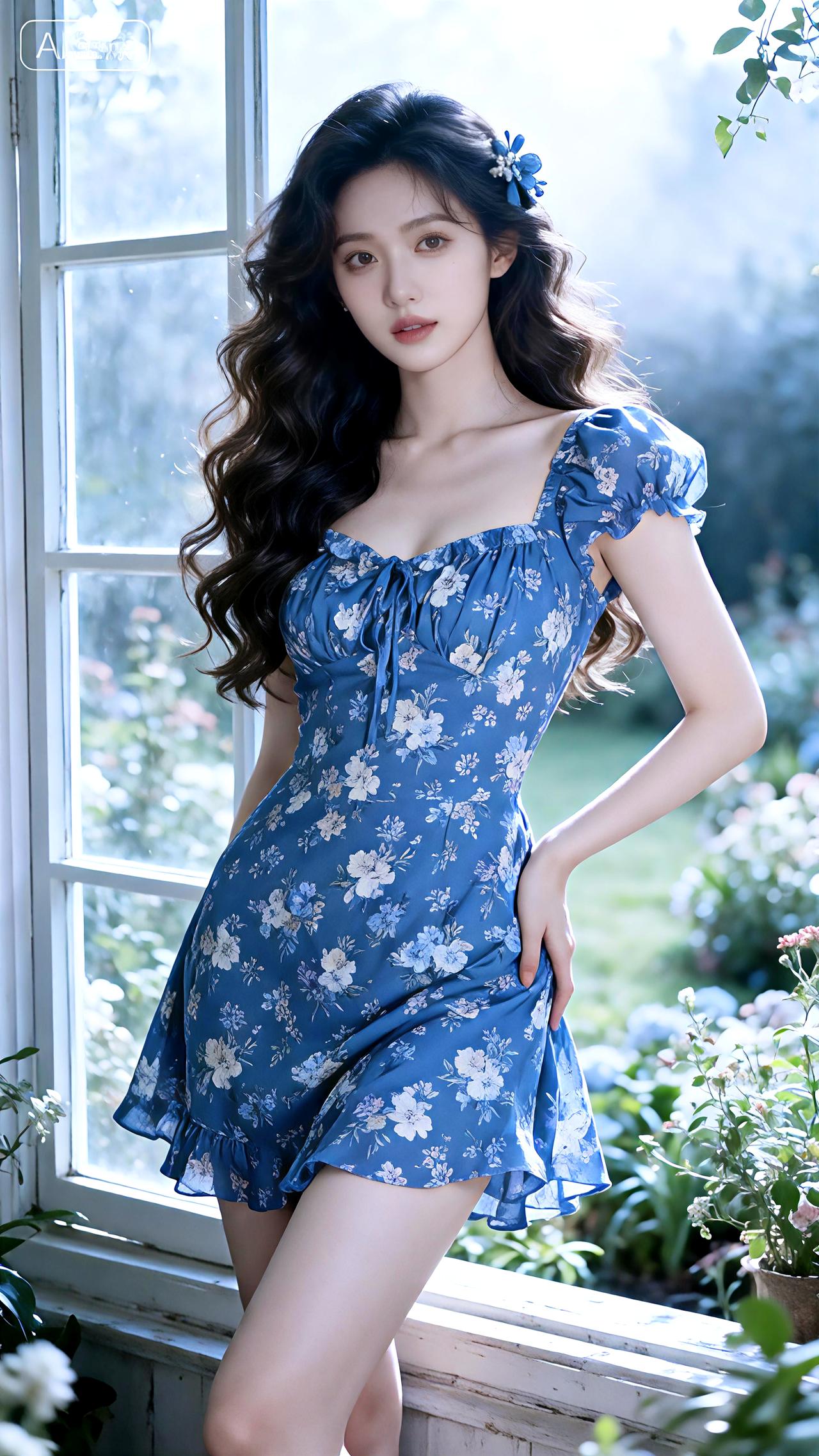 蓝裙碎花随风曳,波浪长发映月华。壁纸 豆包